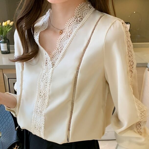 襟、フロント、袖にレースが施された甘いデザインのブラウスです。