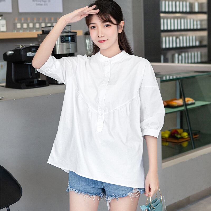 レディース トップス シャツ ブラウス 白シャツ 白トップス 袖あり 5分袖 五分袖 パフスリーブ スタンドカラー かわいい 大人可愛い シンプル おしゃれ お洒落 かっこいい 大人可愛い 大人女子 こなれ感 ラフ メンズライク ラブリー キュート ガーリー M L XL 2XL 3XL 白 ホワイト 無地 春 夏 20代 30代 40代 学生 通学 デート お出かけ 女子会 休日 着回し 普段使い 韓国 韓国系 ファッション 送料無料 | Rena 韓国ファッション レディースアパレル