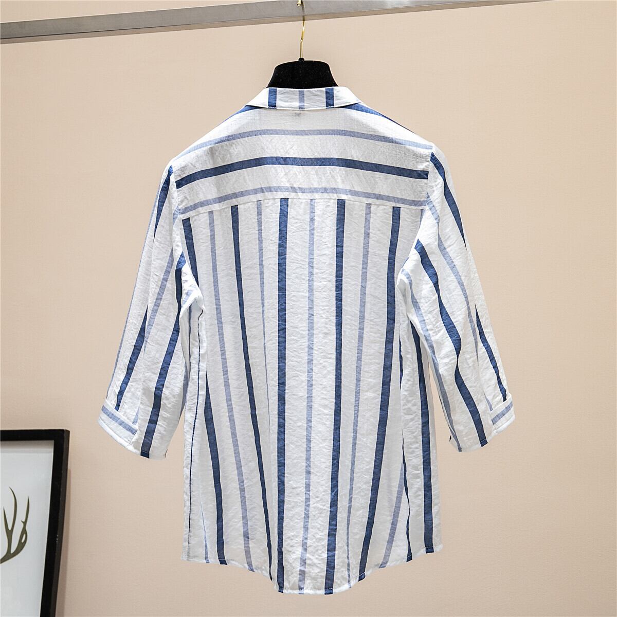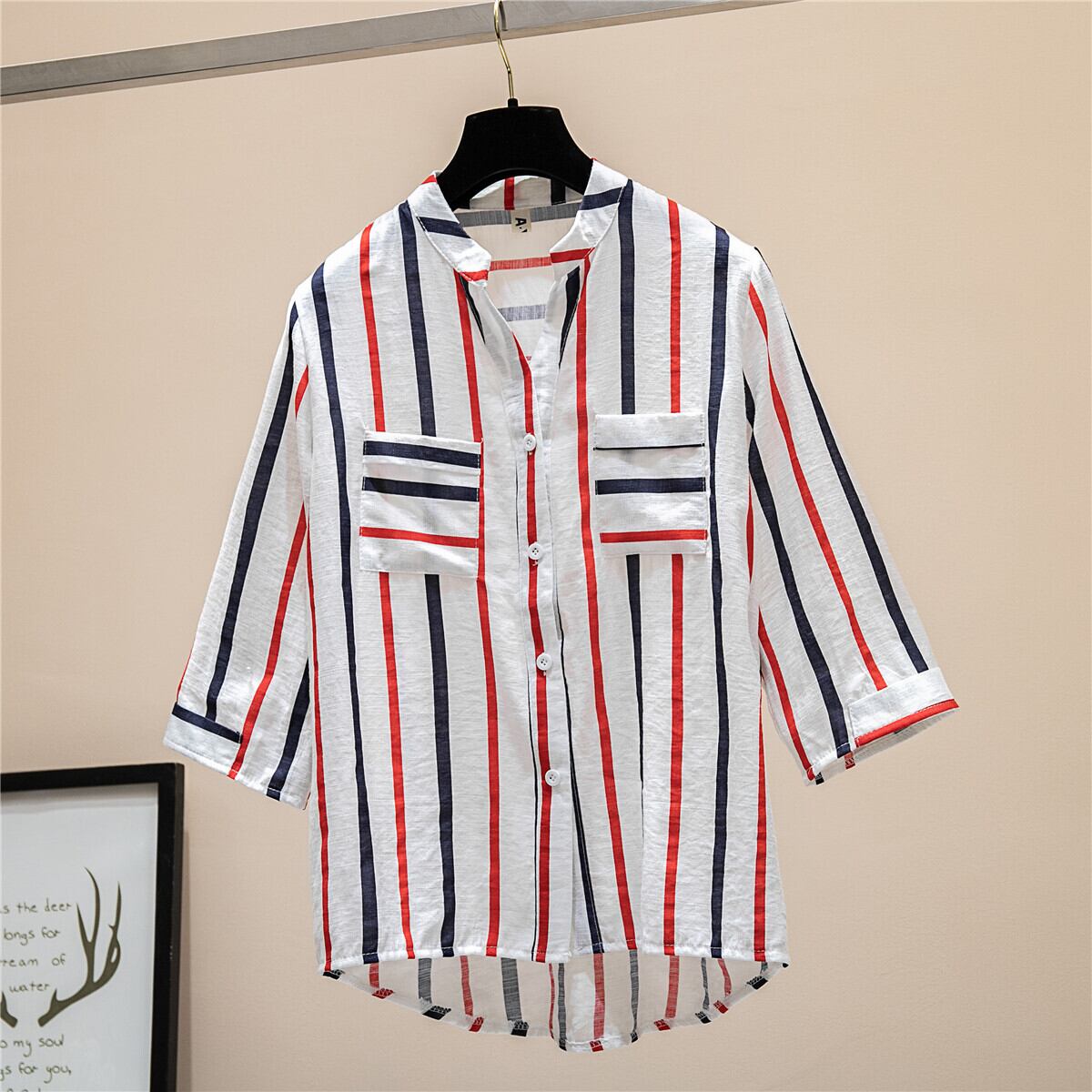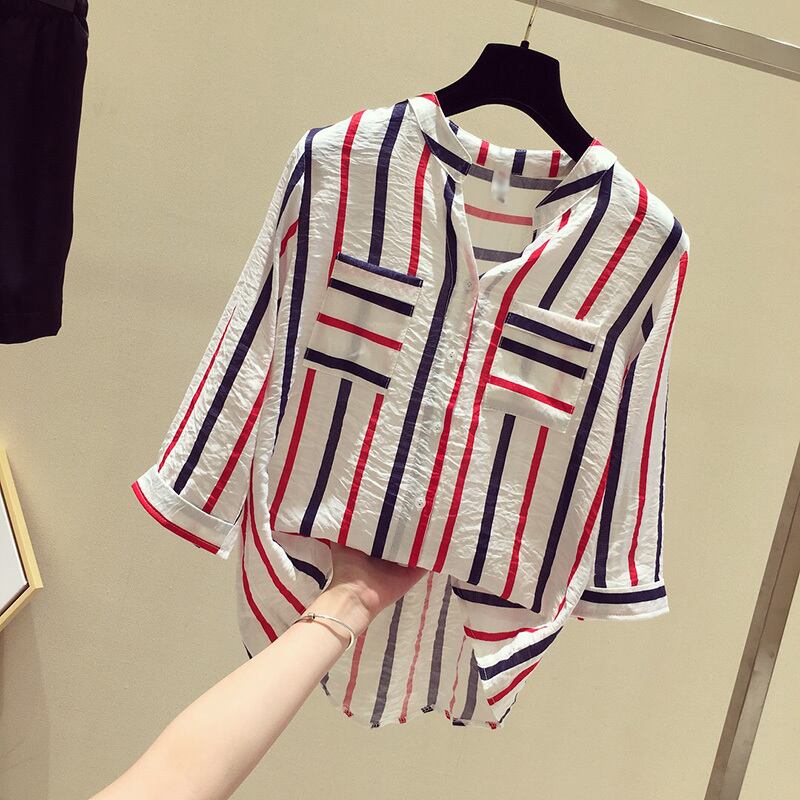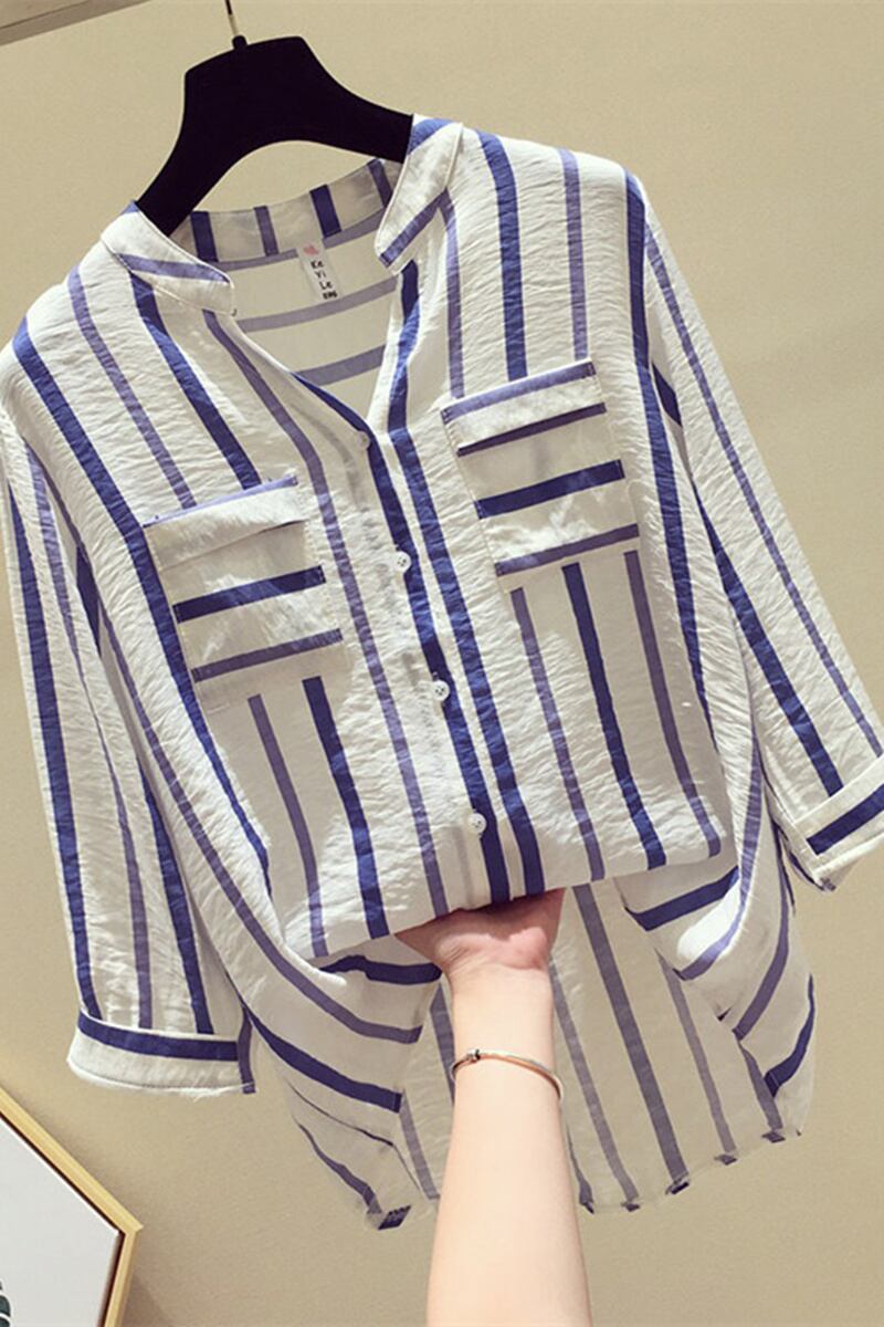 レディース トップス シャツ ブラウス 白シャツ 白トップス 袖あり 7分袖 Vネック 襟なし 透け感 大人可愛い きれいめ 大人 おしゃれ お洒落 かっこいい 大人女子 こなれ感 ラフ メンズライク S M L XL 2XL 白 ホワイト 赤 レッド 青 ブルー ストライプ 春 夏 20代 30代 40代 オフィス OL 通勤 学生 通学 デート お出かけ 女子会 休日 着回し 普段使い 韓国 韓国系 ファッション 送料無料 | Rena 韓国ファッション レディースアパレル