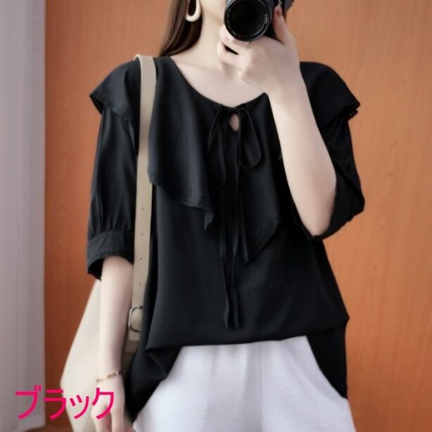レディース トップス ブラウス カットソー 袖あり 5分袖 五分袖 フリル リボン かわいい 大人可愛い シンプル カジュアル 大人 上品 おしゃれ お洒落 大人女子 ガーリー ゆったり 白 ホワイト 黒 ブラック 10代 20代 30代 40代 女性用 ママ デート お出かけ 公園デビュー 女子会 休日 普段使い ファッション コーデ モテ 送料無料