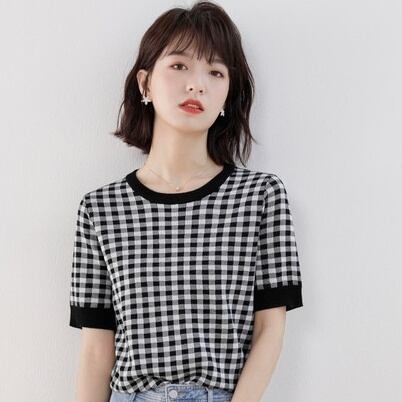 レディース トップス ニットソー 袖あり 半袖 ラウンドネック ニット かわいい 大人可愛い きれいめ カジュアル 大人 上品 おしゃれ お洒落 大人女子 フォーマル M L XL 黒 ブラック ピンク チェック柄 10代 20代 30代 デート お出かけ 公園デビュー 女子会 休日 ファッション コーデ モテ 送料無料 | Rena 韓国ファッション レディースアパレル