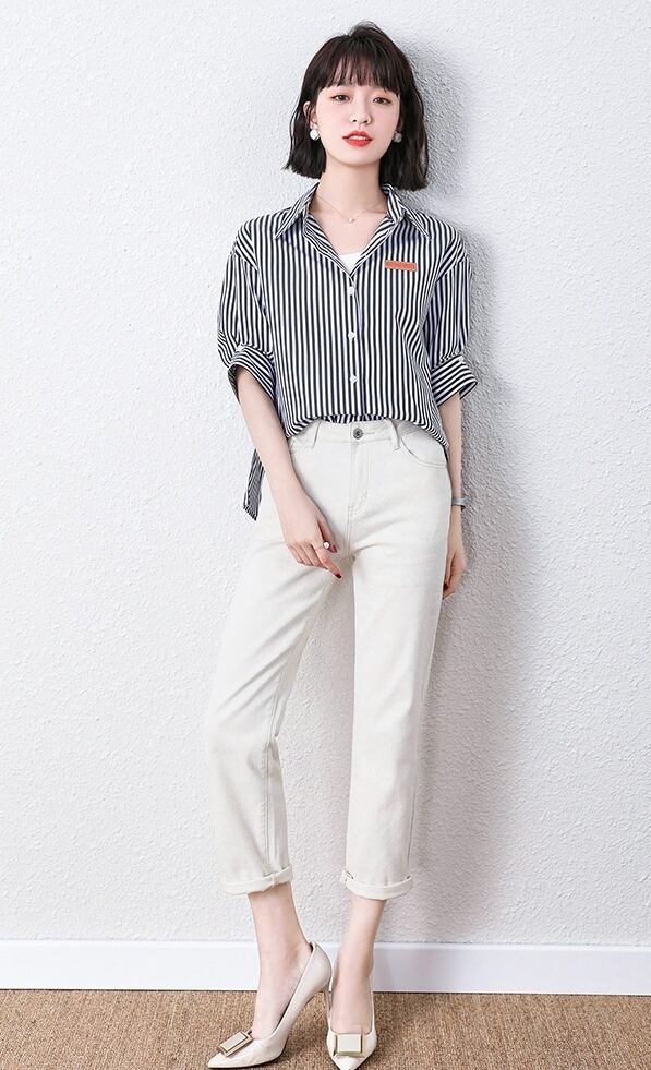 レディース トップス シャツ 袖あり 5分袖 五分袖 大人可愛い きれいめ シンプル カジュアル 大人 上品 おしゃれ お洒落 かっこいい ラフ クール S M L XL 2XL ストライプ 春 夏 10代 20代 30代 40代 着回し 普段使い 重ね着 ファッション コーデ 送料無料 | Rena 韓国ファッション レディースアパレル