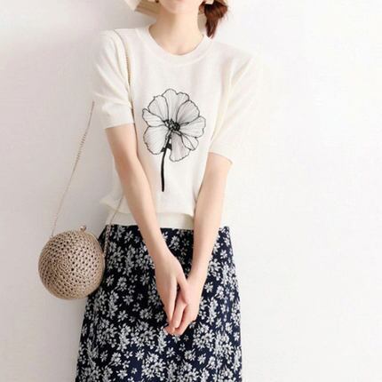レディース トップス カットソー ニット 袖あり 半袖 ラウンドネック スリム サマーニット かわいい 大人可愛い カジュアル 大人 おしゃれ お洒落 大人女子 こなれ感 キュート ガーリー S M L XL ベージュ 花柄 プリント 春 夏 10代 20代 30代 40代 女性用 デート お出かけ 休日 旅行 普段使い ファッション コーデ スタイル 送料無料 | Rena 韓国ファッション レディースアパレル