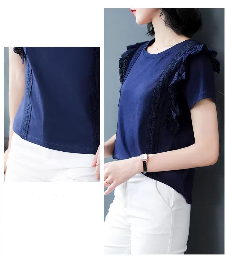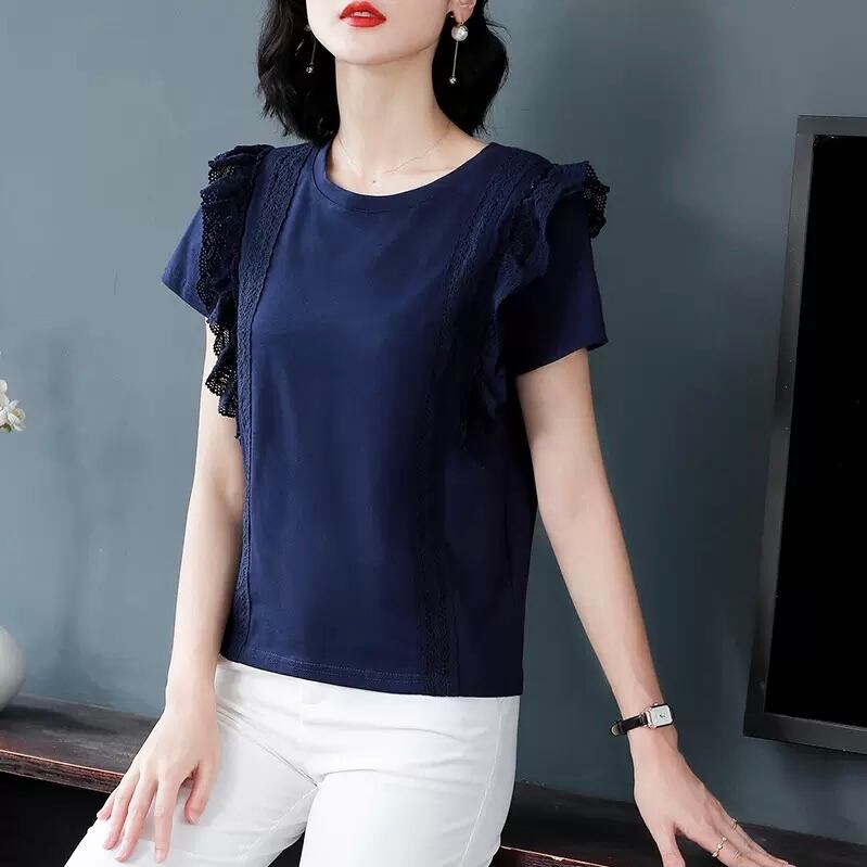 レディース トップス シャツ 袖あり 半袖 ラウンドネック レース かわいい 大人可愛い きれいめ シンプル カジュアル お洒落 大人可愛い 大人女子 ラフ S M L XL 2XL 3XL ネイビー 無地 | Rena 韓国ファッション レディースアパレル