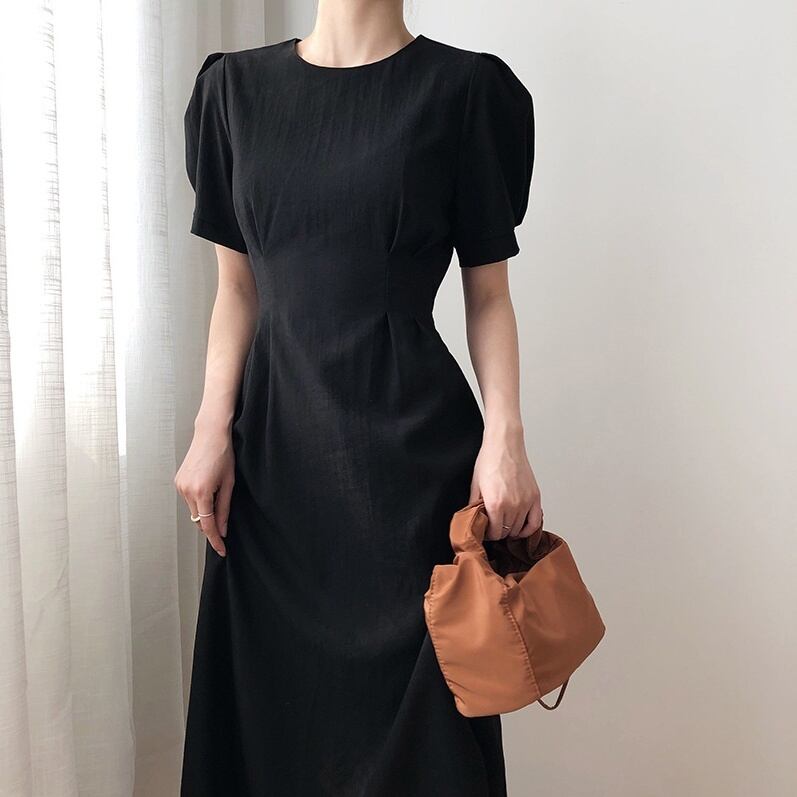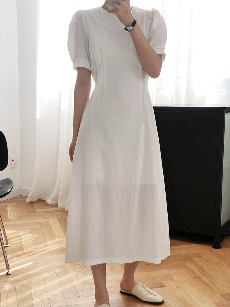 レディース ワンピース ミモレ丈 半袖 Uネック 襟なし スリム 細身 大人可愛い きれいめ シンプル 大人 上品 おしゃれ 大人女子 エレガント M L 白 黒 水色 無地 春 秋 20代 30代 女性用 デート お出かけ イベント ファッション スタイル 送料無料 | Rena 韓国ファッション レディースアパレル
