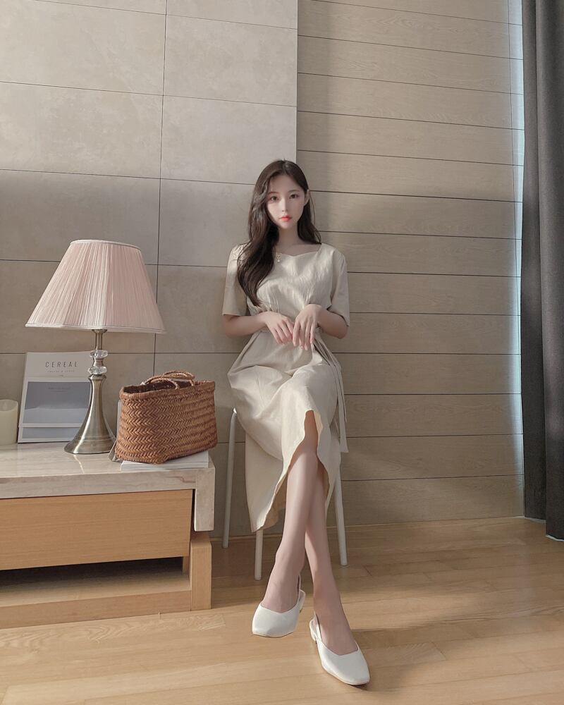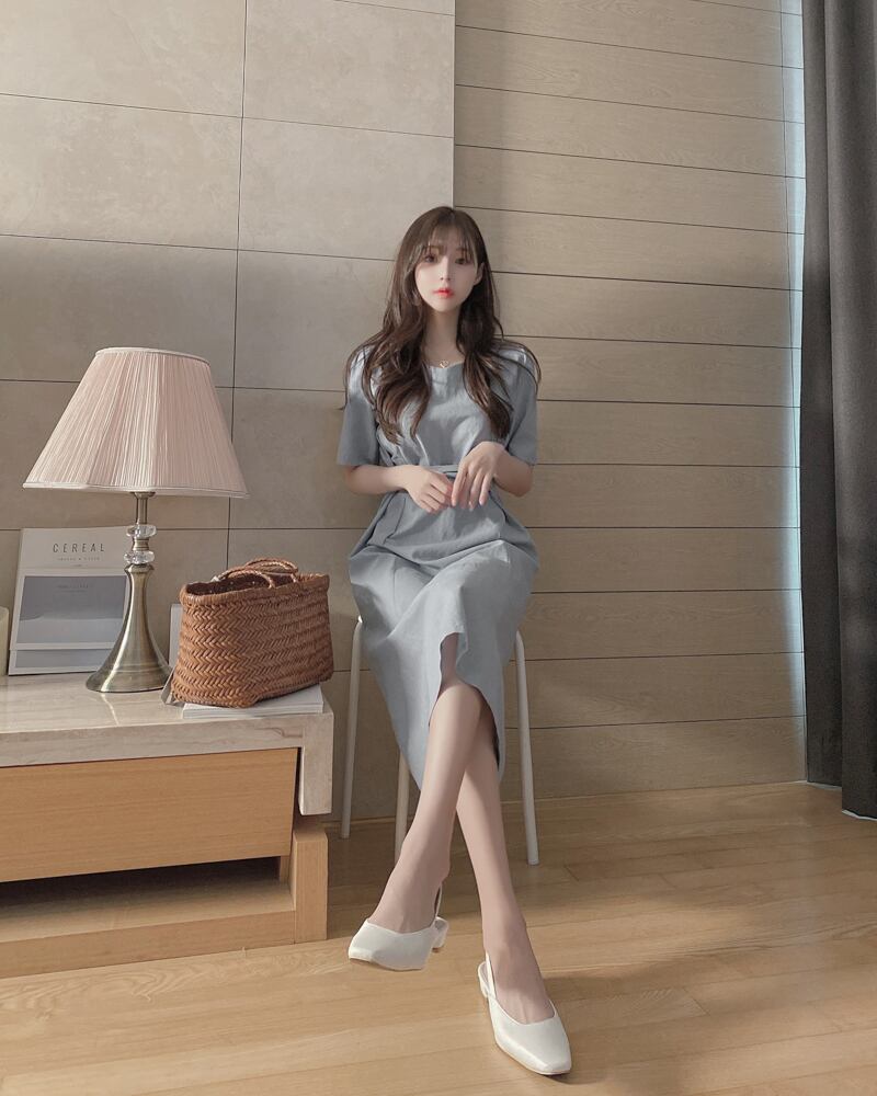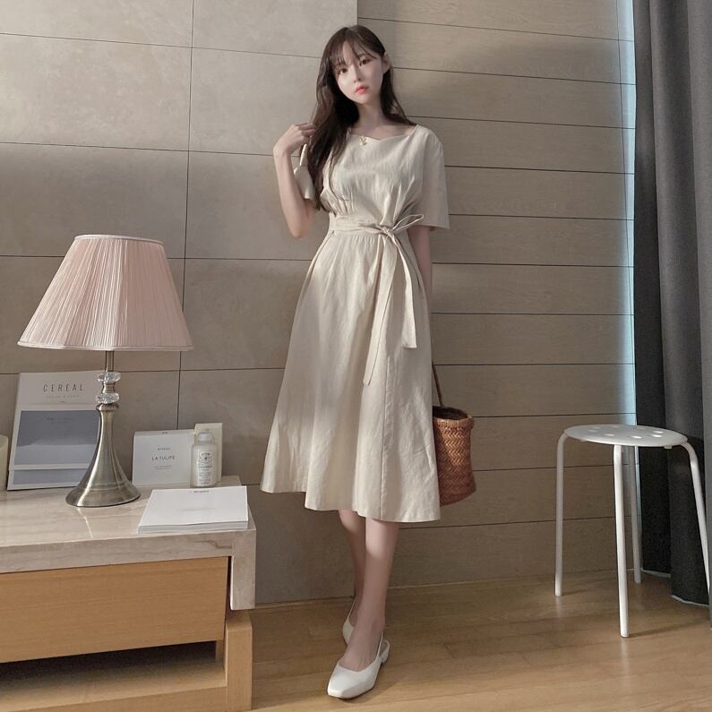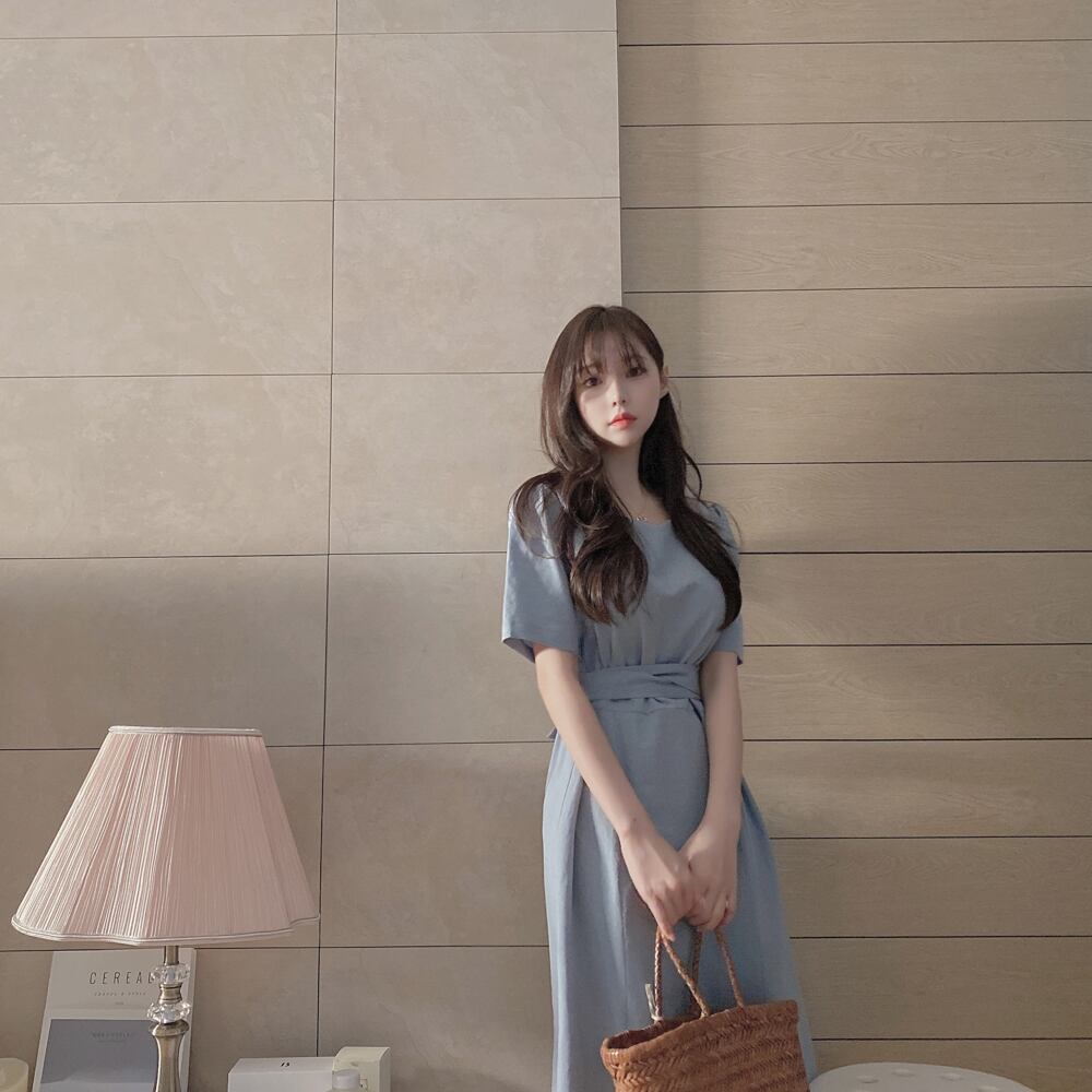 レディース ワンピース 膝下 半袖 襟なし 細身 ウエストリボン 大人可愛い きれいめ シンプル 上品 おしゃれ 大人女子 M L XL 2XL 3XL 4XL 青 ベージュ 無地 春 夏 20代 30代 40代 女性用 デート お出かけ 女子会 イベント ファッション コーデ スタイル モテ 送料無料 | Rena 韓国ファッション レディースアパレル