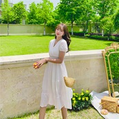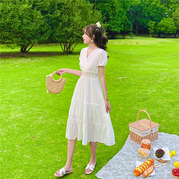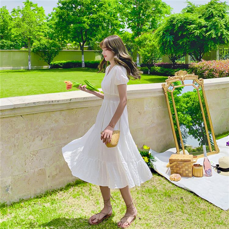 レディース ワンピース フレアワンピース ひざ丈 袖あり 半袖 Vネック フレア シフォン ハイウエスト かわいい 大人可愛い きれいめ シンプル カジュアル 大人 上品 おしゃれ お洒落 大人可愛い 大人女子 こなれ感 ラフ S M L XL 白 ホワイト 大人カラー 無地 春 夏 10代 20代 30代 女性用 学生 デート お出かけ 女子会 休日 旅行 海 普段使い ファッション コーデ スタイル モテ 脚長 送料無料 | Rena 韓国ファッション レディースアパレル
