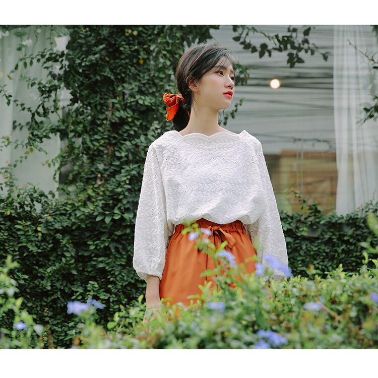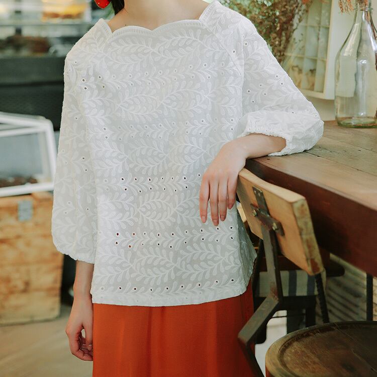 レディース トップス ブラウス 袖あり 長袖 ボートネック レース 刺繍 かわいい 大人可愛い きれいめ シンプル カジュアル 大人 上品 おしゃれ お洒落 レトロ 大人可愛い こなれ感 ガーリー フリーサイズ 白 ホワイト 大人カラー リーフ柄 春 夏 10代 20代 30代 40代 女性用 学生 通学 デート お出かけ 女子会 休日 旅行 普段使い ファッション コーデ スタイル 送料無料 | Rena 韓国ファッション レディースアパレル