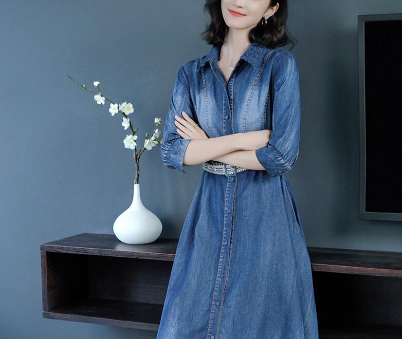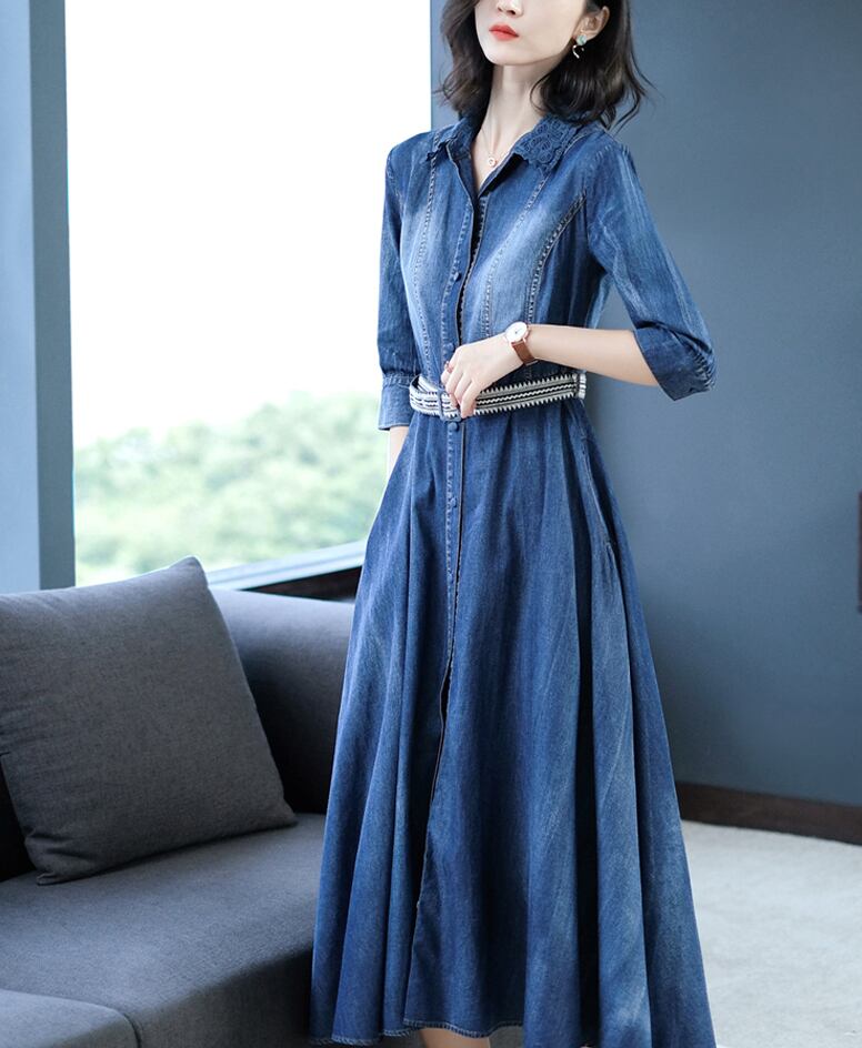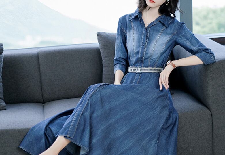レディース ワンピース プリーツスカート デニムワンピース ロング丈 袖あり 七分袖 フレア プリーツ ベルト ブルーデニム かわいい 大人可愛い きれいめ シンプル カジュアル 大人 上品 おしゃれ お洒落 かっこいい アジアン 大人可愛い 大人女子 こなれ感 ラフ ラブリー キュート ガーリー XS S M L XL 2XL 3XL ブルー 春 夏 秋 10代 20代 30代 40代 女性用 学生 通学 デート お出かけ 女子会 休日 旅行 普段使い ファッション コーデ スタイル 送料無料 | Rena 韓国ファッション レディースアパレル