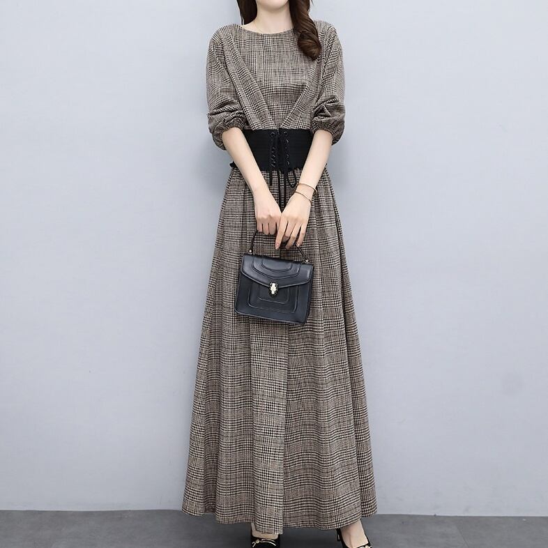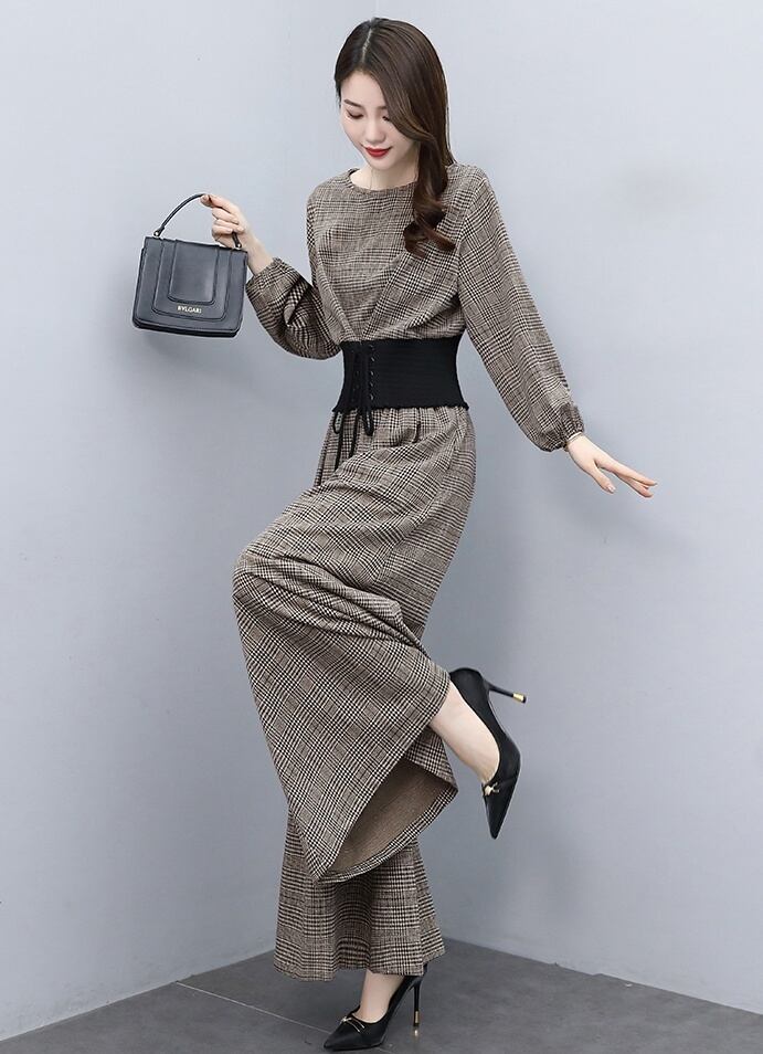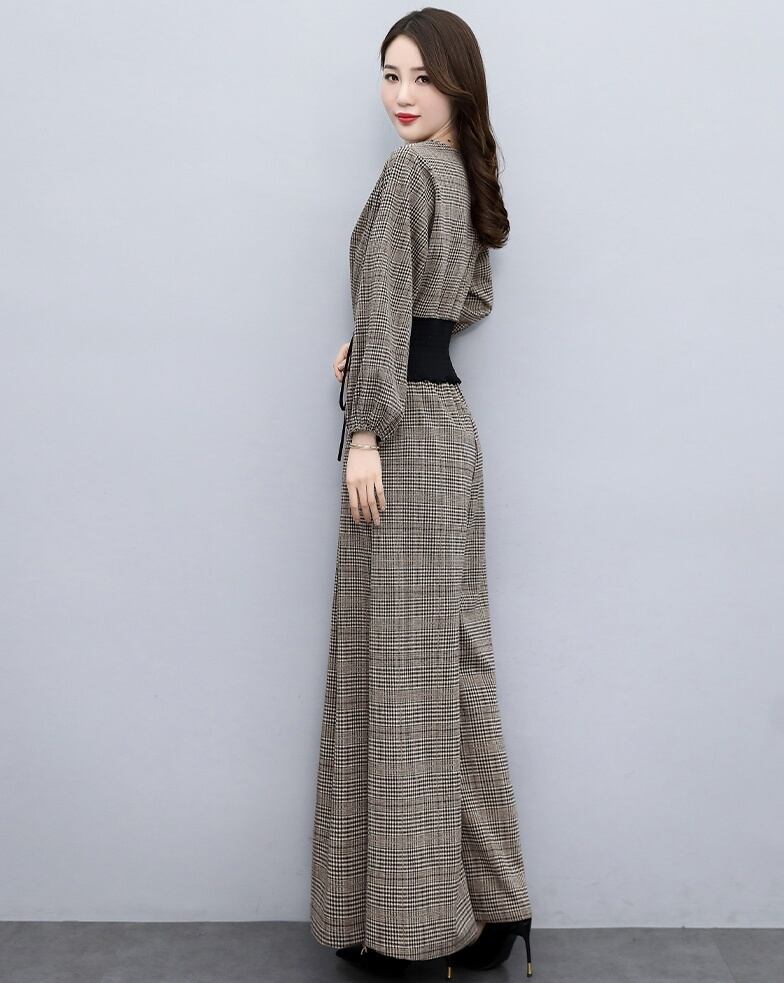 レディース パンツ セットアップ 長袖 ラウンドネック 襟なし ワイド ウエストゴム 上下セット ツーピース 大人可愛い きれいめ シンプル 大人 上品 おしゃれ 大人女子 エレガント 主役級 存在感 M L XL 2XL ブラウン グレー チェック柄 春 秋 20代 30代 40代 女性用 デート お出かけ 女子会 休日 イベント ファッション コーデ スタイル モテ 送料無料 | Rena 韓国ファッション レディースアパレル
