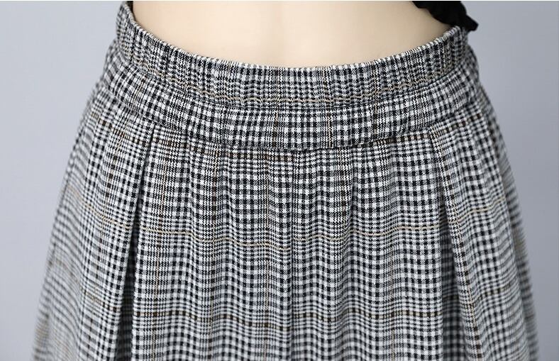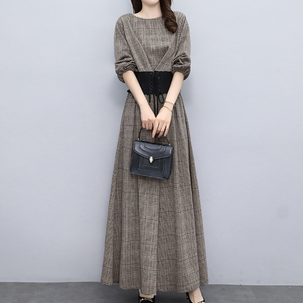 グレンチェックにレースアップのウエストマークがポイントのセットアップ。