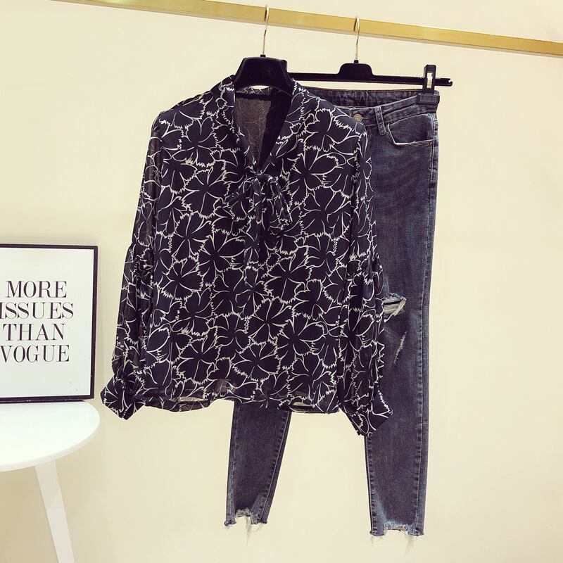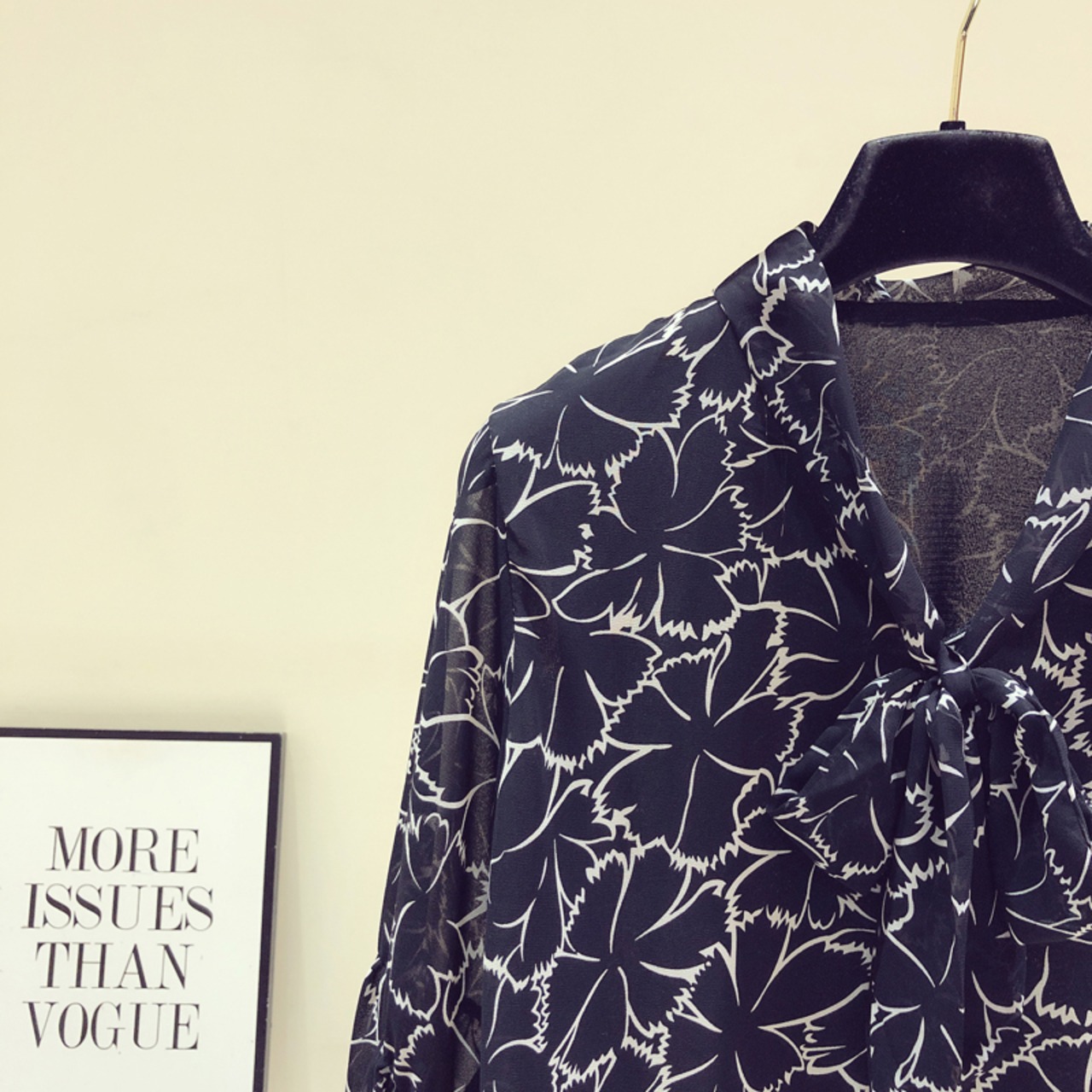 ボウタイリボンのついたモノトーンの花柄ブラウス。
