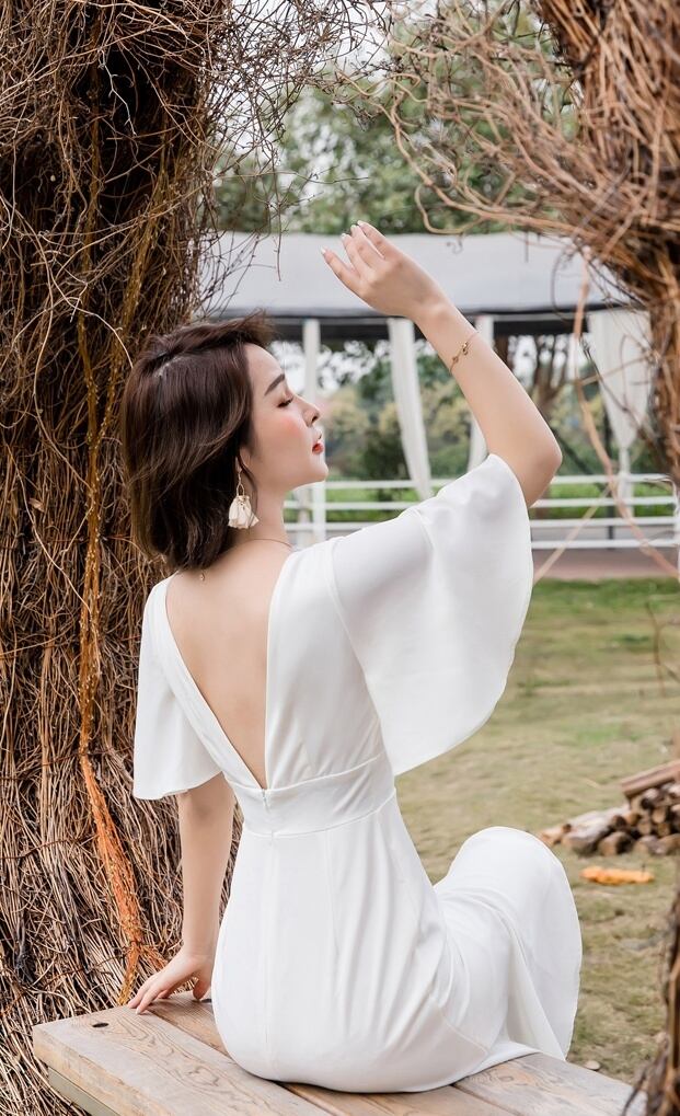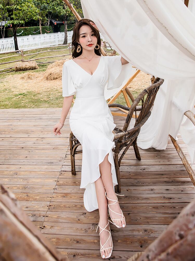 レディース ワンピース ワンピドレス ロング ロング丈 半袖 Vネック 裾フレア フリル かわいい 大人可愛い きれいめ 大人 おしゃれ 大人女子 ラブリー セクシー 主役級 存在感 S M L XL 白 ホワイト 無地 春 夏 秋 披露宴 10代 20代 お出かけ 休日 パーティー リゾート 旅行 ファッション コーデ スタイル 美脚 送料無料 | Rena 韓国ファッション レディースアパレル