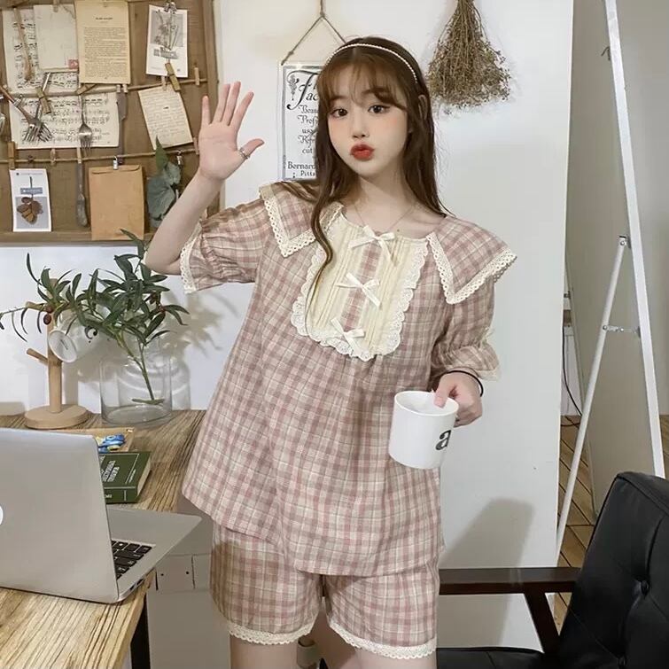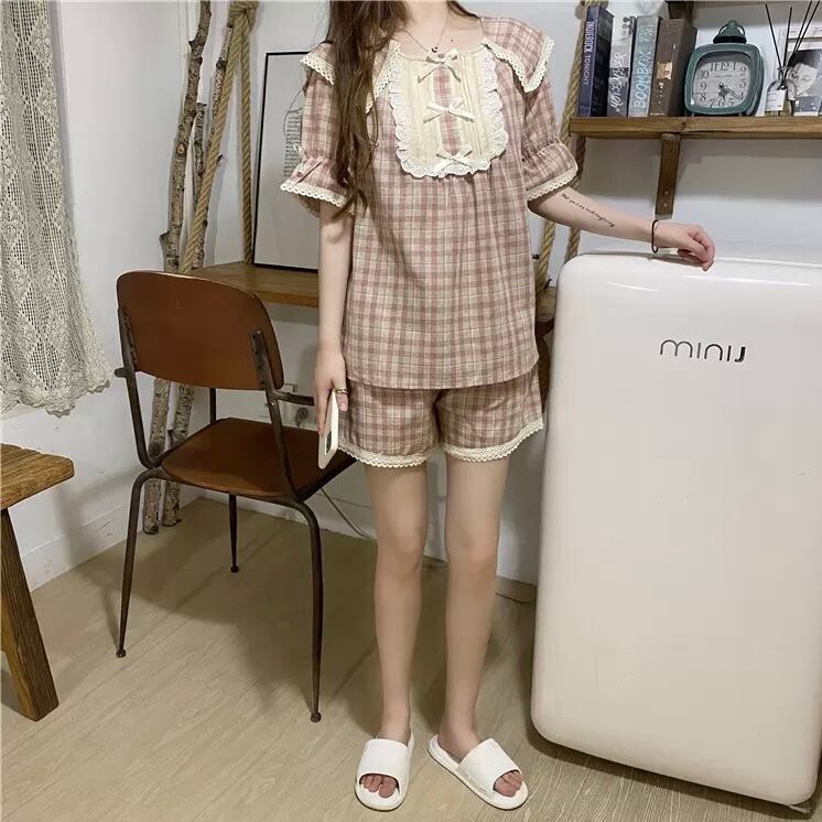 レディース パジャマ 寝巻き ナイトウェア ショート ショート丈 袖あり 半袖 Uネック 襟付き フリル リボン ウエストゴム 薄手 上下セット 2点セット ツーピース かわいい 大人可愛い ラブリー キュート ガーリー フリーサイズ グリーン ピンク 柄 チェック柄 夏 10代 20代 女性用 お泊まり 普段使い 楽ちん 送料無料 | Rena 韓国ファッション レディースアパレル