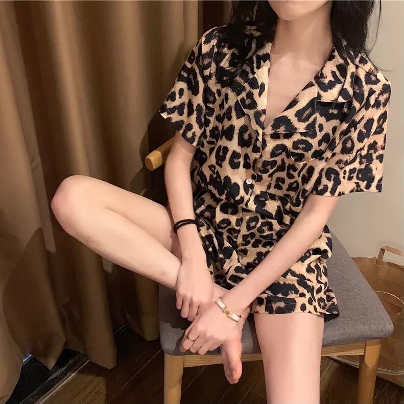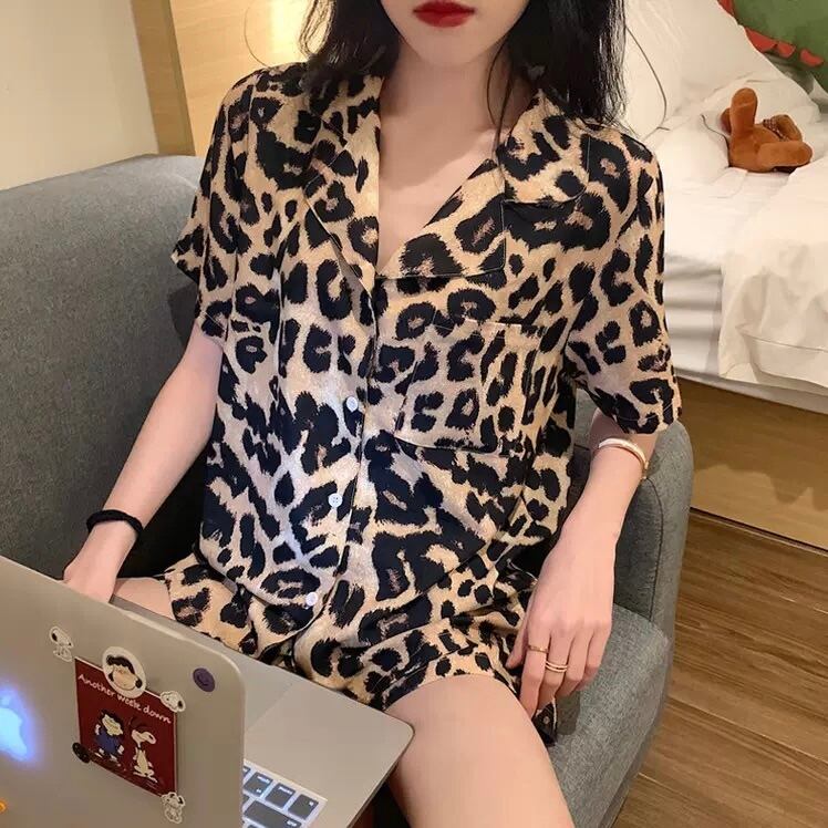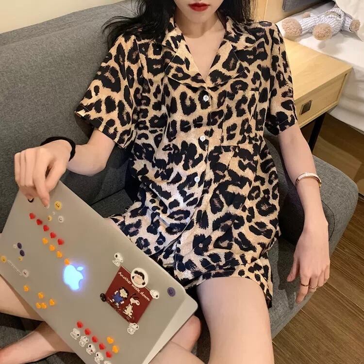 レディース ルームウェア パジャマ 部屋着 寝巻き ナイトウェア ショート ショート丈 袖あり 半袖 Vネック 襟付き 前開き ウエストゴム 薄手 上下セット 2点セット ツーピース おしゃれ お洒落 大人可愛い キュート クール セクシー フリーサイズ 柄 ヒョウ柄 夏 2021 10代 20代 ママ お泊まり 休日 普段使い 送料無料 | Rena 韓国ファッション レディースアパレル