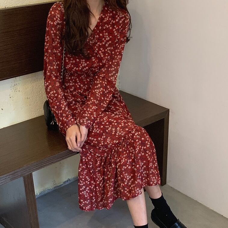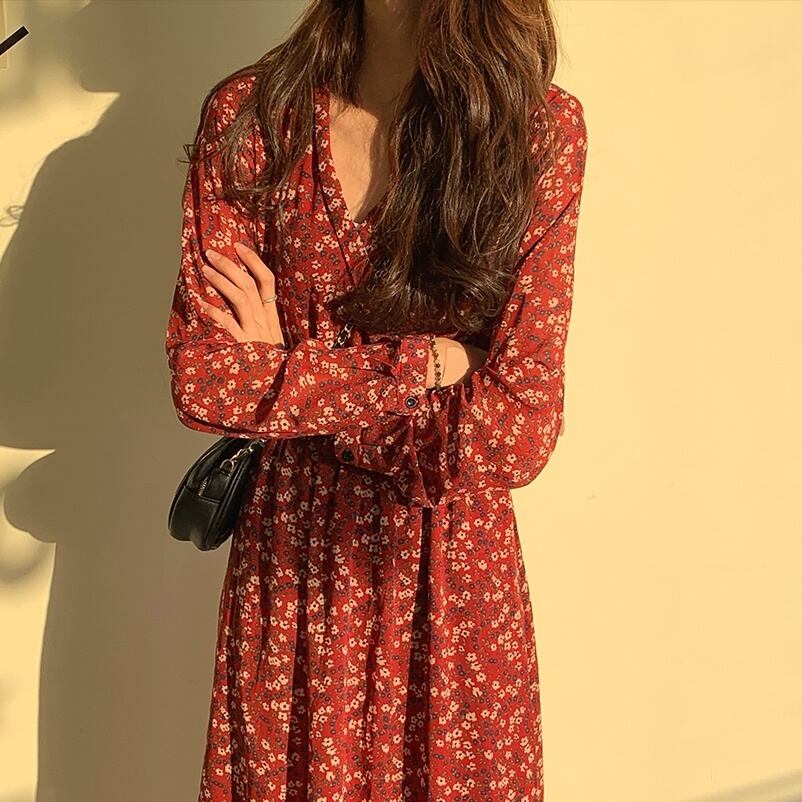 レディース レディース スカート ワンピース ロングスカート ロング丈 袖あり 長袖 Vネック 細身 ストレート Aライン マーメイド 刺繍 フリル 伸縮性 綿 かわいい 大人可愛い きれいめ シンプル カジュアル 大人 上品 おしゃれ レトロ キュート ルーズ とろみ感 抜け感 M L XL ゆったり 赤 花柄 小花柄 春 秋 10代 20代 30代 女性用 デート お出かけ 休日 韓国 韓国系 ファッション コーデ スタイル 楽ちん プチプラ 安い インスタ映え 送料無料 | Rena 韓国ファッション レディースアパレル