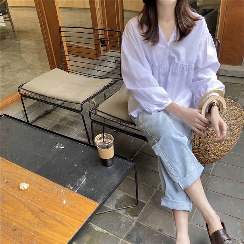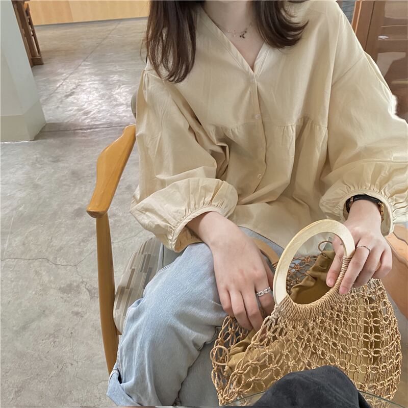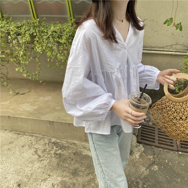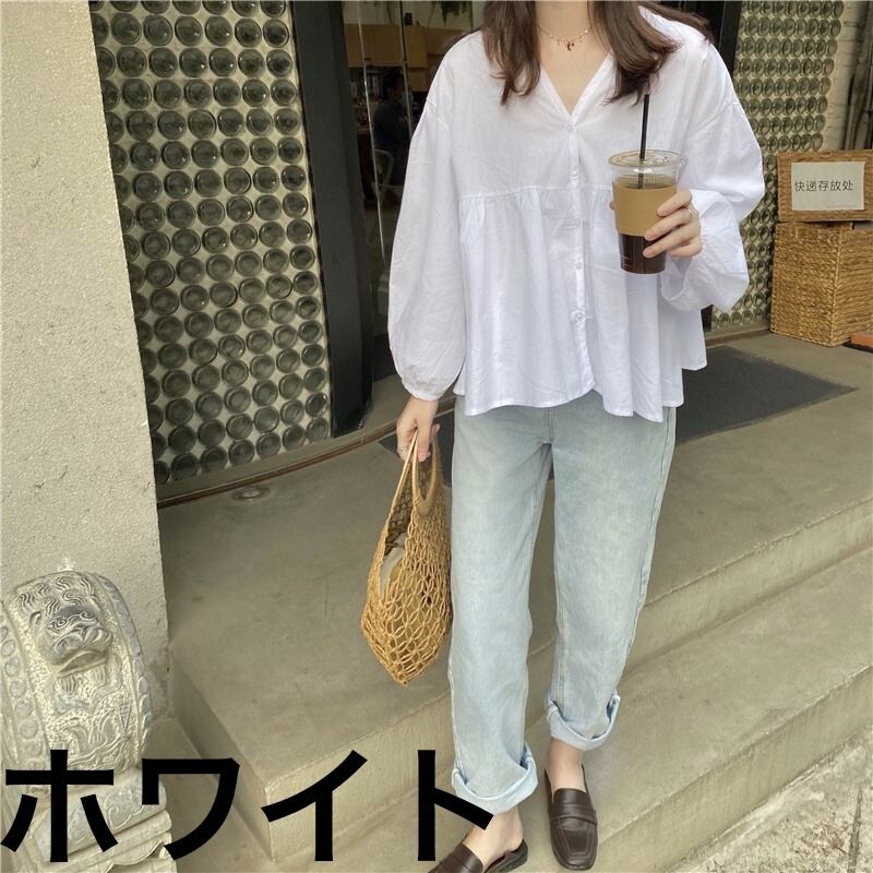 レディース トップス シャツ ブラウス 袖あり 長袖 ボリューム袖 Vネック スリム 綿 きれいめ シンプル カジュアル 大人 上品 おしゃれ お洒落 ワンサイズ 白 ホワイト ベージュ 無地 春 夏 10代 20代 30代 オフィス ビジネス OL 通勤 学生 通学 デート お出かけ 公園デビュー 休日 韓国 韓国系 ファッション コーデ スタイル モテ 送料無料 流行 | Rena 韓国ファッション レディースアパレル