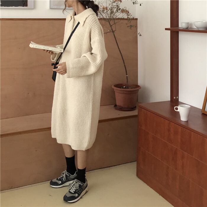 レディース ワンピース ロング丈 ニット 袖あり 長袖 ボリューム袖 ストレート Iライン ケーブルニット 伸縮性 綿 ニット 大人可愛い きれいめ シンプル カジュアル 大人 おしゃれ お洒落 大人可愛い 大人女子 ラフ ワンサイズ 灰色 グレー オフホワイト ベージュ 春カラー 無地 春 秋 冬 10代 20代 30代 OL 通勤 学生 デート お出かけ 女子会 休日 ファッション スタイル 楽ちん あったか 暖かい モテ 送料無料 トレンド 流行 | Rena 韓国ファッション レディースアパレル