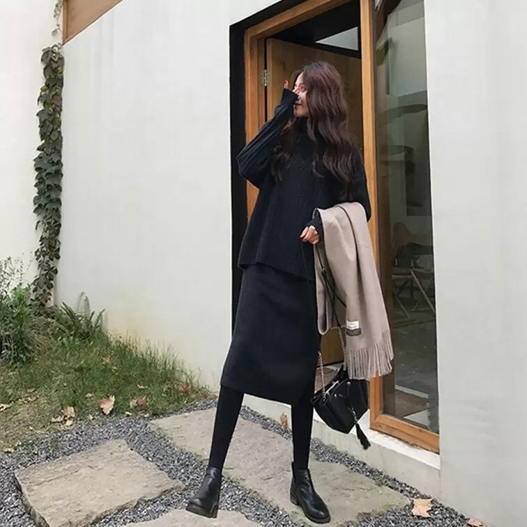レディース トップス ワンピース ニット 膝丈 ひざ丈 ミディアム丈 袖あり 長袖 Vネック タートルネック ストレート サイドスリット 2way ニット 厚手 2点セット ツーピース お得 大人可愛い シンプル カジュアル 大人 おしゃれ S M L XL 黒 ブラック 青 ブルー ベージュ 大人カラー 秋カラー 無地 秋 冬 10代 20代 30代 女性用 ママ 学生 通学 デート お出かけ 公園デビュー 女子会 休日 着回し 普段使い 重ね着 コーデ 暖かい 送料無料 | Rena 韓国ファッション レディースアパレル