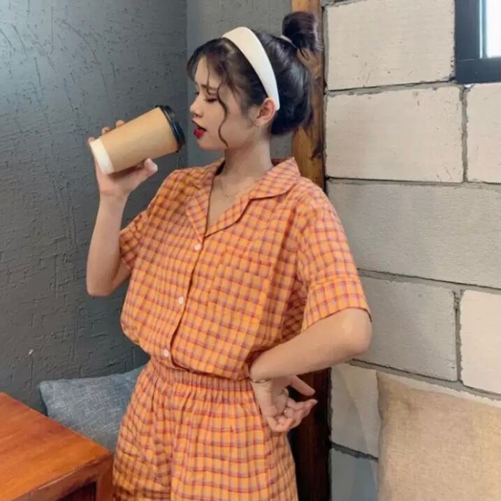 レディース ルームウェア パジャマ 部屋着 寝巻き ナイトウェア ショート ショート丈 袖あり 半袖 Vネック 襟付き ポケット 前開き ウエストゴム 薄手 上下セット 2点セット ツーピース かわいい 大人可愛い ラブリー キュート S M L 緑 グリーン 紫 パープル ピンク オレンジ チェック柄 夏 2021 10代 20代 女性用 ママ 女の子 お泊まり 休日 普段使い 楽ちん 新作 送料無料 | Rena 韓国ファッション レディースアパレル