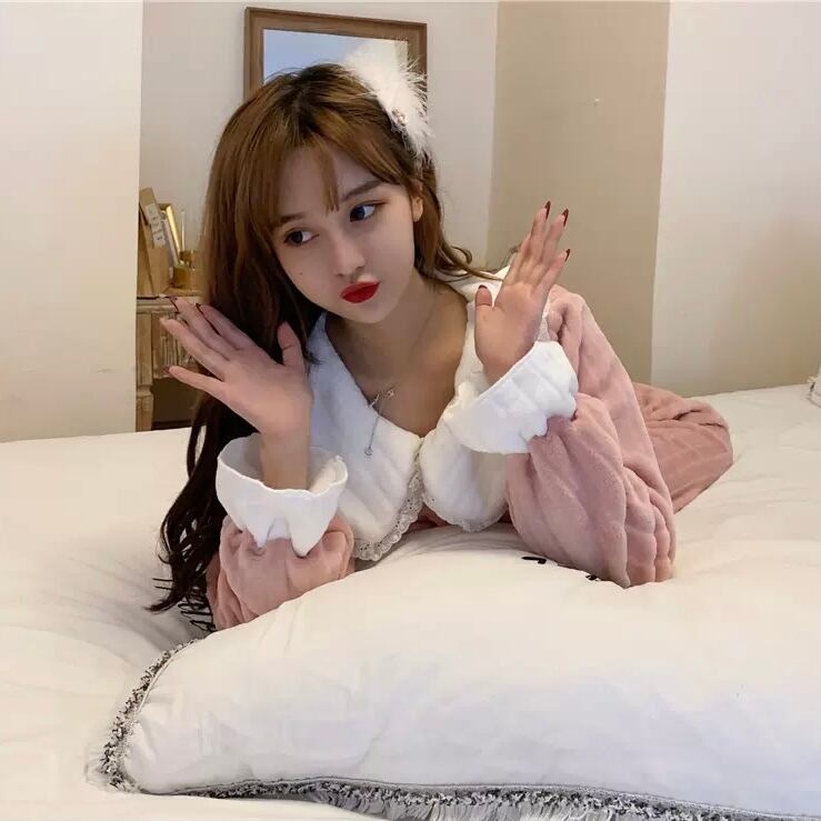 レディース ルームウェア パジャマ 部屋着 寝巻き ナイトウェア ロング ロング丈 袖あり 長袖 襟付き 裾フレア フリル ふわふわ 前開き ウエストゴム ポリエステル 厚手 ベルベット 上下セット 2点セット ツーピース かわいい 大人女子 メンズライク キュート ガーリー M L XL 2XL 白 ホワイト ピンク 秋 冬 10代 20代 女性用 女の子 お泊まり 休日 普段使い 楽ちん あったか 暖かい 送料無料 ゆったり | Rena 韓国ファッション レディースアパレル