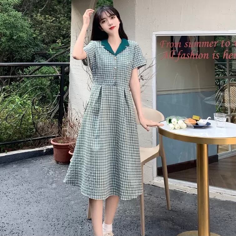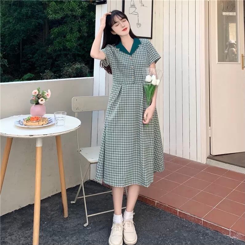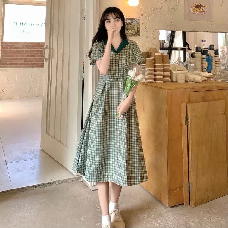 レディース ワンピース 膝丈 ひざ丈 ミディアム丈 袖あり 半袖 Vネック 襟付き セミフレア 切り替えデザイン 前開き かわいい 大人可愛い 大人可愛い メンズライク ガーリー L XL 2XL 3XL 4XL 大きいサイズ 大きめ グリーン 柄 チェック柄 ギンガムチェック 夏 2021 10代 20代 女性用 ママ 女の子 学生 通学 デート お出かけ 女子会 お泊まり 普段使い モテ 体系カバー 送料無料 | Rena 韓国ファッション レディースアパレル