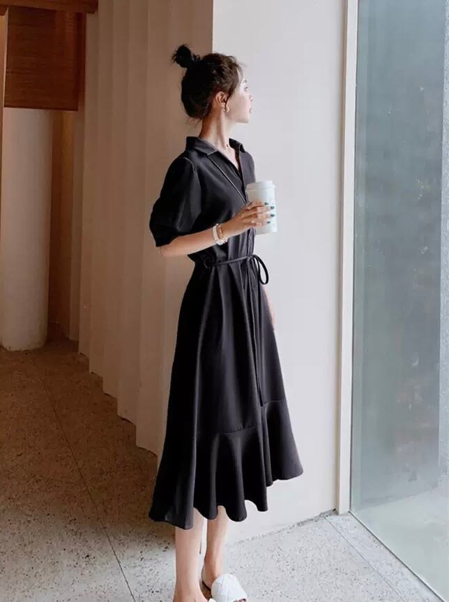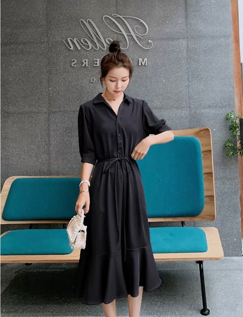 レディース ワンピース シャツワンピース 膝下 ミディアム丈 袖あり 5分袖 Vネック 襟付き 切り替えデザイン 裾フレア マーメイド ウエストマーク ハイウエスト 前開き きれいめ シンプル 大人 上品 おしゃれ 大人女子 メンズライク M L XL 2XL 3XL 4XL 大きいサイズ 大きめ 黒 ブラック 青 ブルー 無地 夏 2021 20代 30代 通勤 学生 通学 デート お出かけ 公園デビュー 女子会 リゾート 旅行 普段使い モテ 美脚 送料無料 | Rena 韓国ファッション レディースアパレル