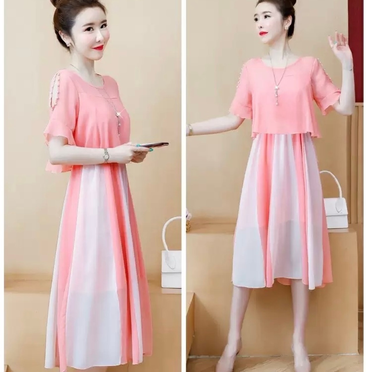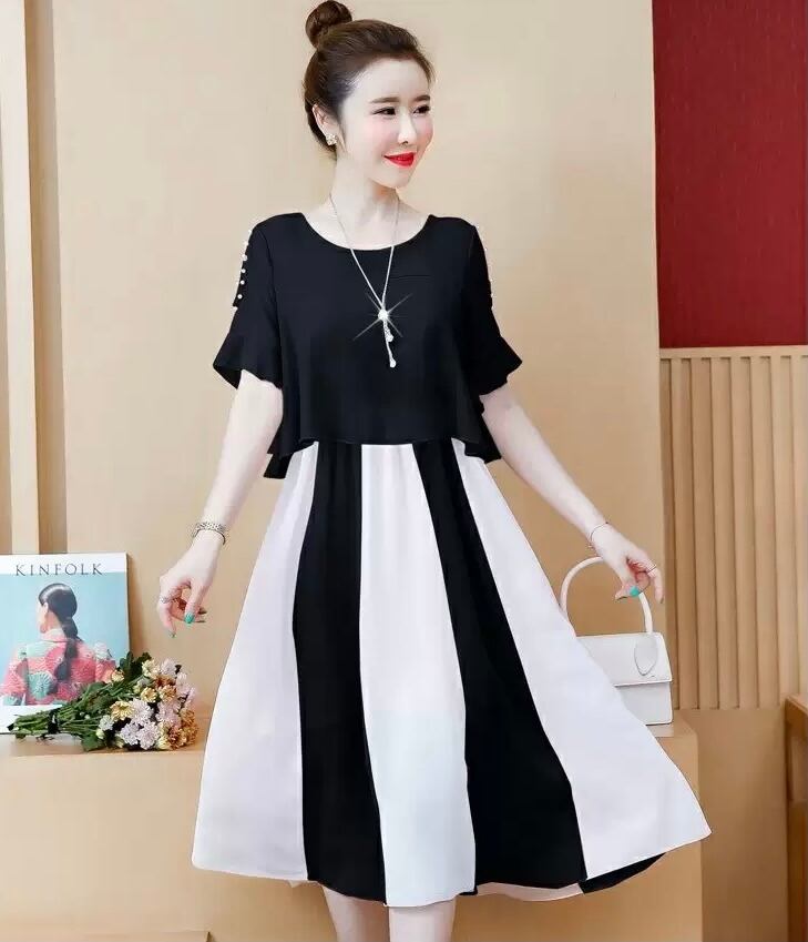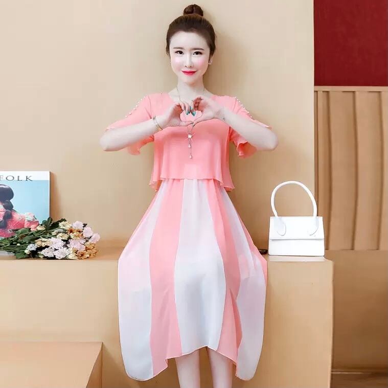 レディース ドレス dress ワンピース パーティードレス カラードレス 膝丈ドレス 膝下 袖あり 半袖 フレアスリーブ ラウンドネック 切り替えデザイン ハイウエスト 透け感 かわいい おしゃれ 存在感 ラブリー キュート お姫様 L XL 2XL 3XL 4XL 5XL 大きいサイズ 大きめ 黒 ブラック ピンク 柄 ストライプ シーズンレス 二次会 お呼ばれ パーティー 2021 10代 20代 女性用 イベント リゾート ホテル ガーデン 体系カバー 二の腕カバー 送料無料 | Rena 韓国ファッション レディースアパレル