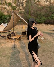 レディース ワンピース ワンピドレス ロング ロング丈 半袖 ラウンドネック タイト スリット かわいい 大人可愛い きれいめ シンプル カジュアル 大人 上品 おしゃれ お洒落 大人可愛い 大人女子 ラフ キュート 個性的 主役級 存在感 フリーサイズ 黒 ブラック 灰色 グレー 春 夏 秋 20代 30代 40代 女性用 オフィス OL 通勤 女子会 休日 普段使い お揃い 韓国系 ファッション コーデ スタイル モテ 体系カバー 美脚 脚長 定番 送料無料 トレンド 流行 インスタ映え