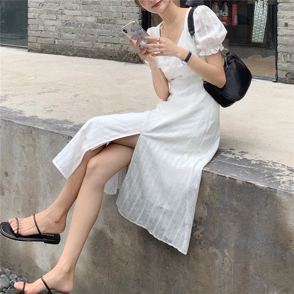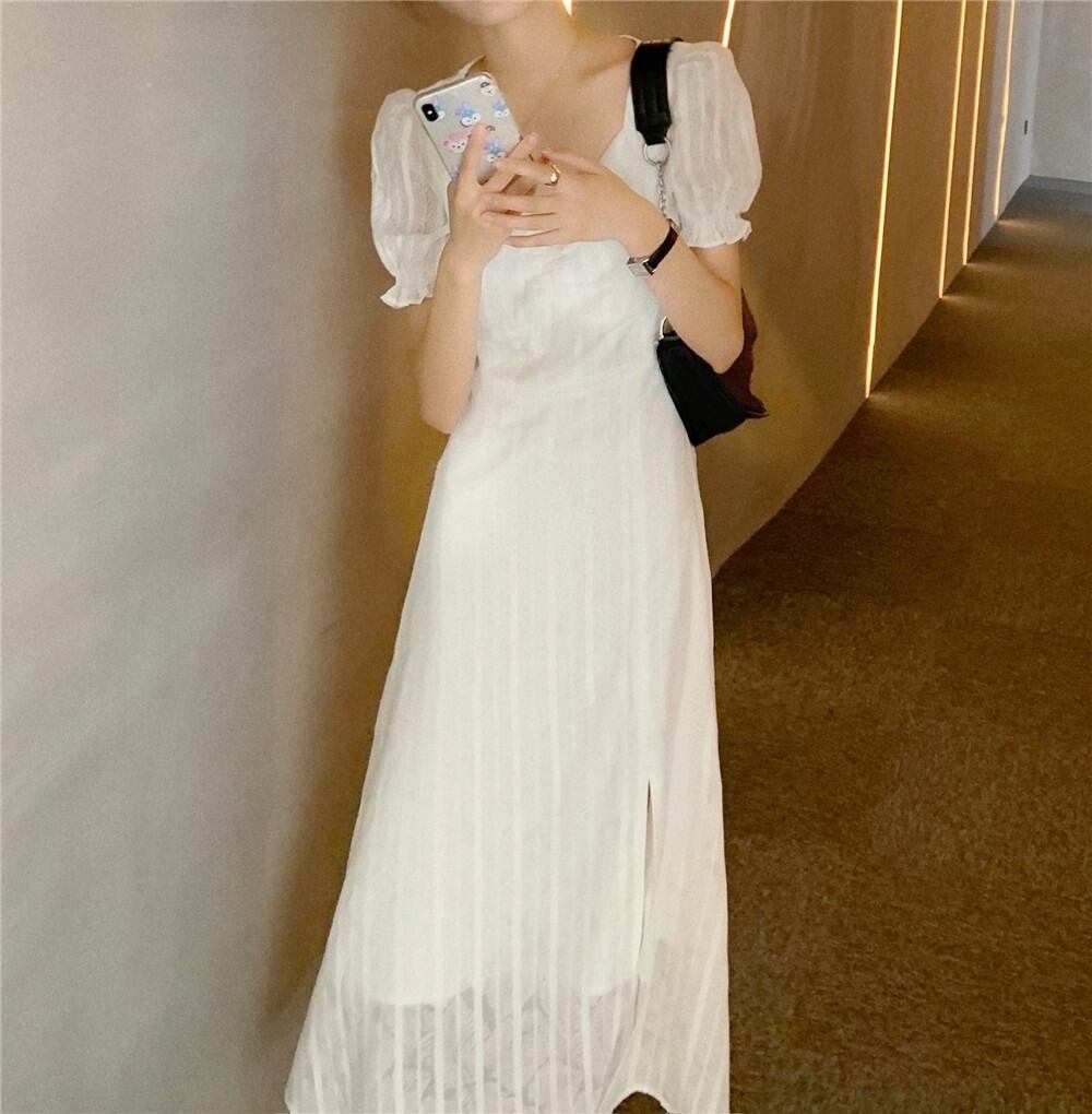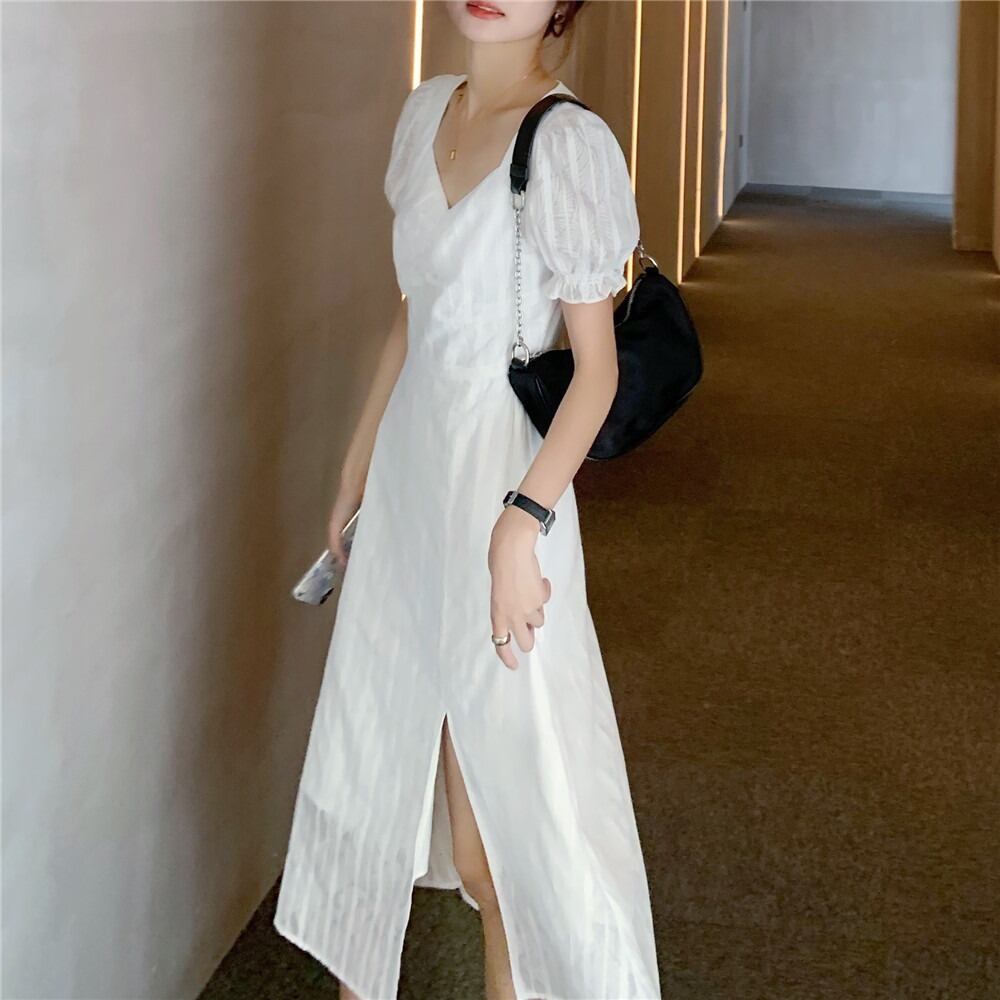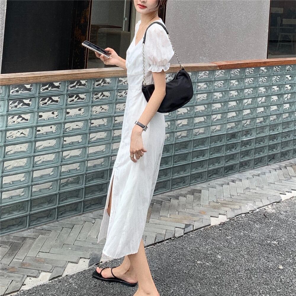 レディース ワンピース ミモレ ミモレ丈 袖あり 半袖 スリット かわいい 大人可愛い 大人 上品 おしゃれ お洒落 大人可愛い 大人女子 S M L XL 白 ホワイト 無地 春 夏 10代 20代 30代 デート お出かけ 女子会 休日 パーティー イベント ファッション 送料無料 | Rena 韓国ファッション レディースアパレル
