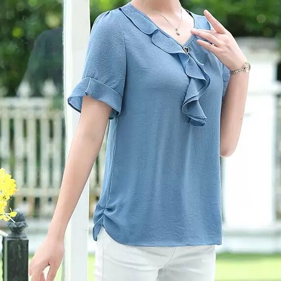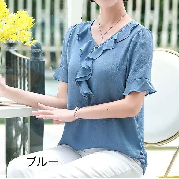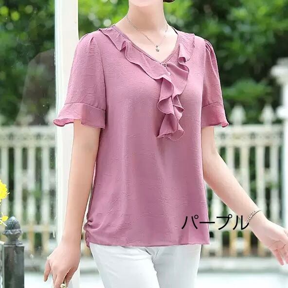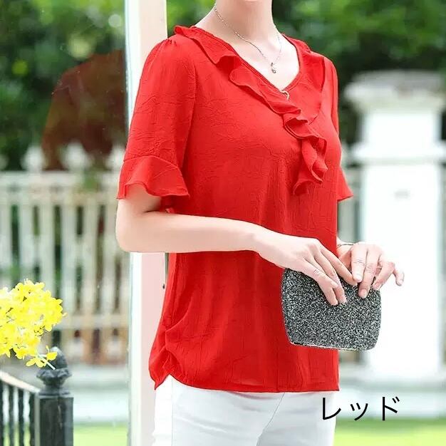 レディース トップス ブラウス 袖あり 半袖 ラウンドネック セミフレア フリル リボン 伸縮性 綿 薄手 きれいめ シンプル カジュアル 大人 上品 おしゃれ お洒落 XL 2XL 3XL 4XL 5XL 赤 レッド 青 ブルー 紫 パープル オレンジ 秋カラー 無地 春 夏 10代 20代 30代 40代 オフィス ビジネス OL 通勤 お出かけ 普段使い ファッション コーデ スタイル モテ 定番 送料無料 トレンド 流行 インスタ映え | Rena 韓国ファッション レディースアパレル