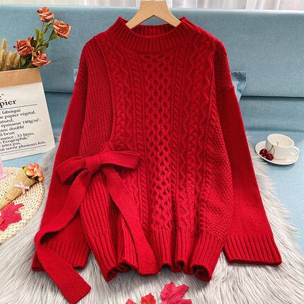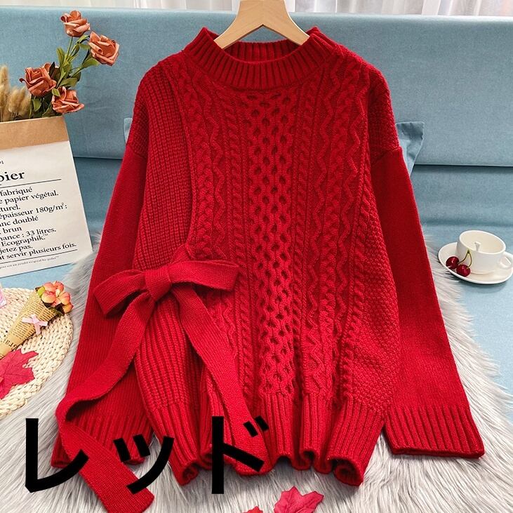 レディース トップス セーター 袖あり 長袖 ラウンドネック リボン もこもこ 厚手 かわいい 大人可愛い きれいめ シンプル カジュアル 大人 おしゃれ お洒落 大人可愛い 大人女子 こなれ感 ラフ M L XL 2XL 黒 ブラック 赤 レッド 秋カラー 無地 秋 冬 10代 20代 30代 ビジネス OL 通勤 学生 通学 デート お出かけ 女子会 休日 着回し 重ね着 韓国 韓国系 ファッション コーデ スタイル 楽ちん あったか 暖かい モテ 定番 送料無料 トレンド 流行 インスタ映え | Rena 韓国ファッション レディースアパレル