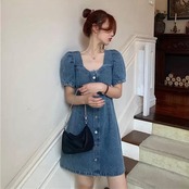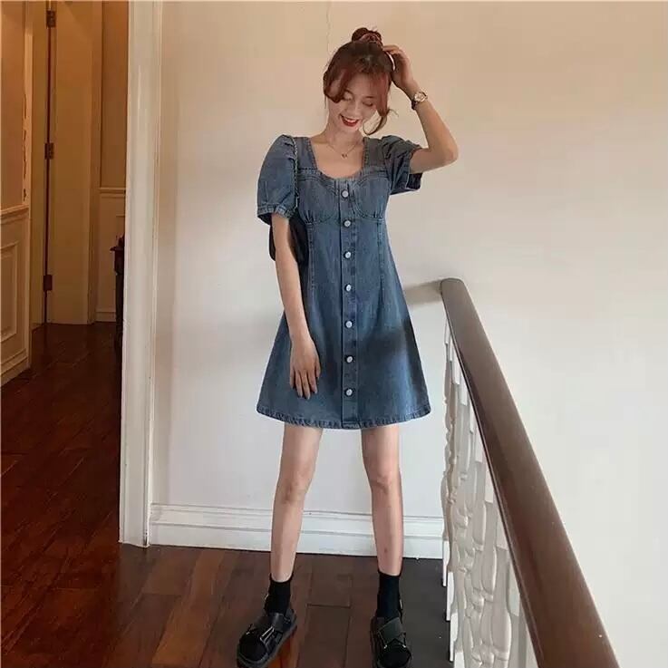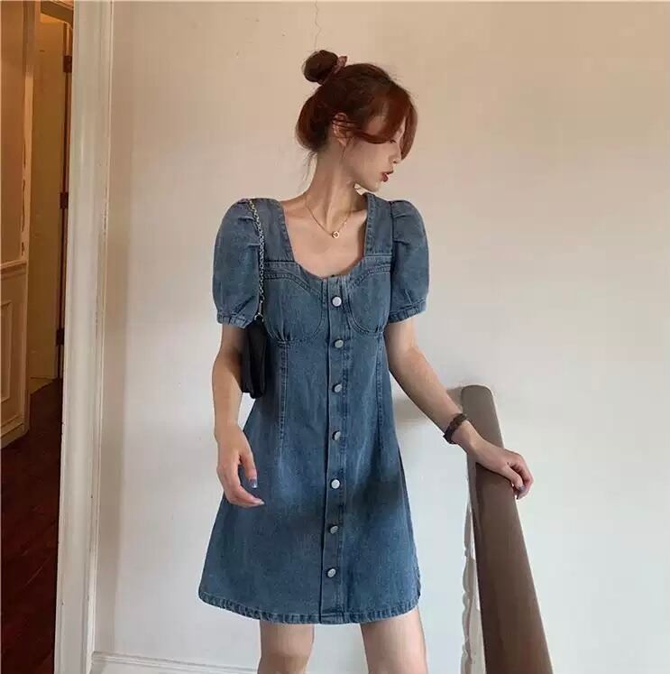 レディース ワンピース デニムワンピース ショート ショート丈 膝上 袖あり 半袖 パフスリーブ スクエアネック Aライン ハイウエスト 前開き デニム 薄手 かわいい カジュアル おしゃれ 大人可愛い キュート ガーリー セクシー M L XL 2XL 3XL 4XL 青 ブルー 無地 夏 2021 10代 20代 女性用 ママ 学生 通学 デート お出かけ 女子会 休日 旅行 着回し 普段使い 韓国系 オルチャン モテ 新作 送料無料 | Rena 韓国ファッション レディースアパレル