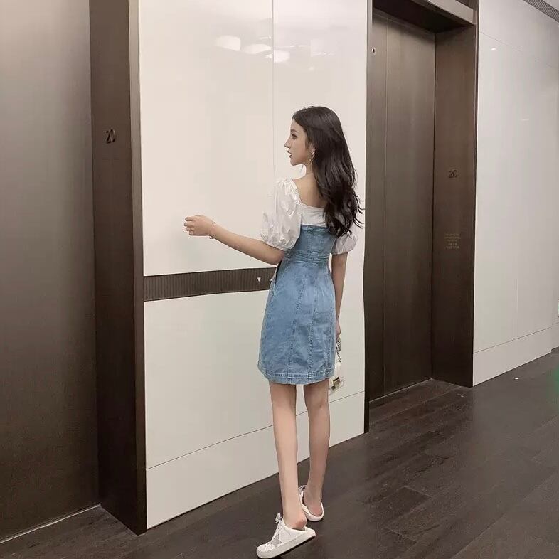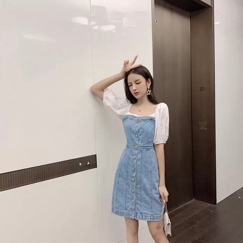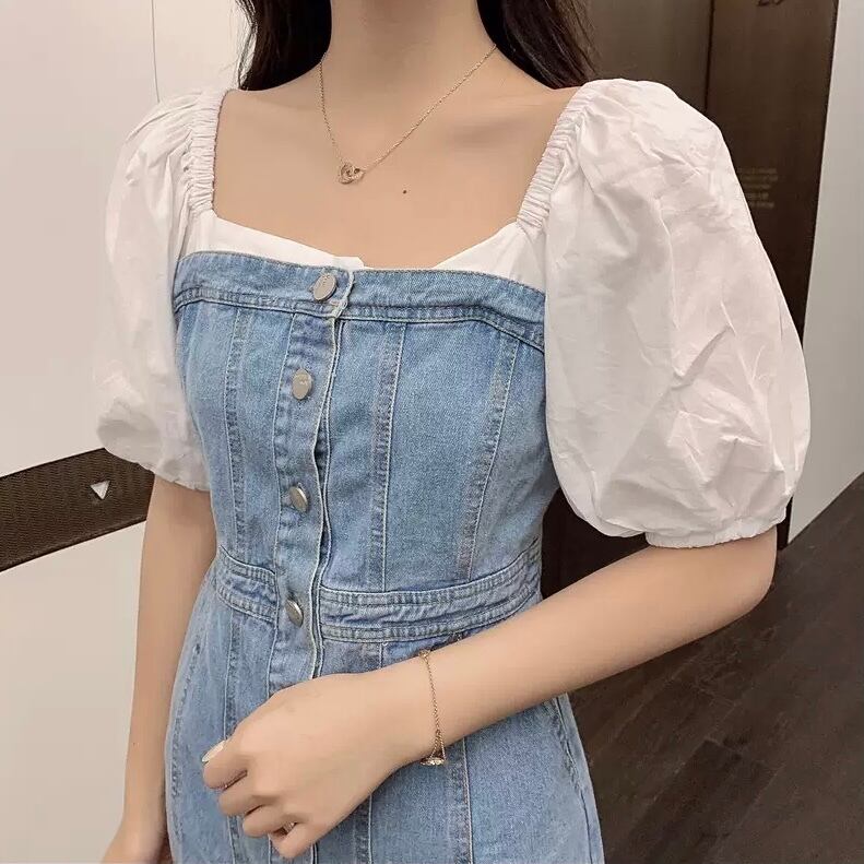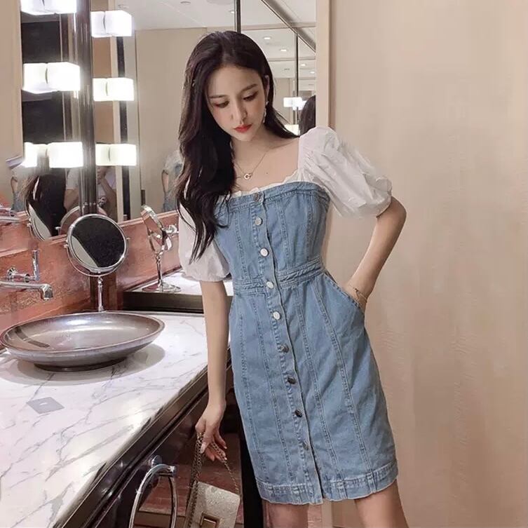 レディース ワンピース デニムワンピース ショート ショート丈 袖あり 半袖 パフスリーブ スクエアネック スリム Aライン レイヤード ウエストマーク ハイウエスト 前開き 綿 デニム 大人可愛い おしゃれ 大人可愛い 大人女子 ラブリー キュート ガーリー XS S M L XL 白 ホワイト 青 ブルー 無地 夏 2021 10代 20代 女性用 女の子 学生 通学 デート お出かけ 女子会 休日 リゾート 旅行 韓国系 オルチャン ファッション コーデ 脚長 送料無料 | Rena 韓国ファッション レディースアパレル