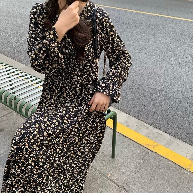 レディース ワンピース フレアワンピース 膝丈 ひざ丈 ミディアム丈 袖あり 長袖 パフスリーブ Vネック フレア レイヤード かわいい 大人可愛い カジュアル 大人 おしゃれ レトロ 大人女子 メンズライク キュート M L XL 2XL 3XL 4XL 大きいサイズ 大きめ ゆったり 黒 ブラック 柄 花柄 小花柄 フラワー 10代 20代 女性用 ママ マタニティ 通勤 学生 通学 デート お出かけ 公園デビュー 女子会 休日 韓国系 オルチャン モテ 体系カバー 送料無料 | Rena 韓国ファッション レディースアパレル