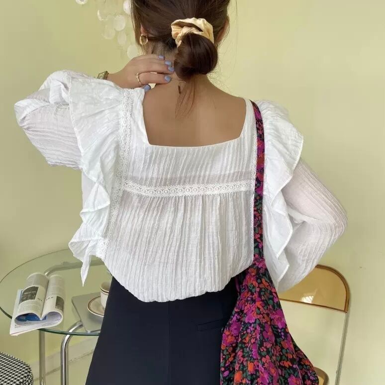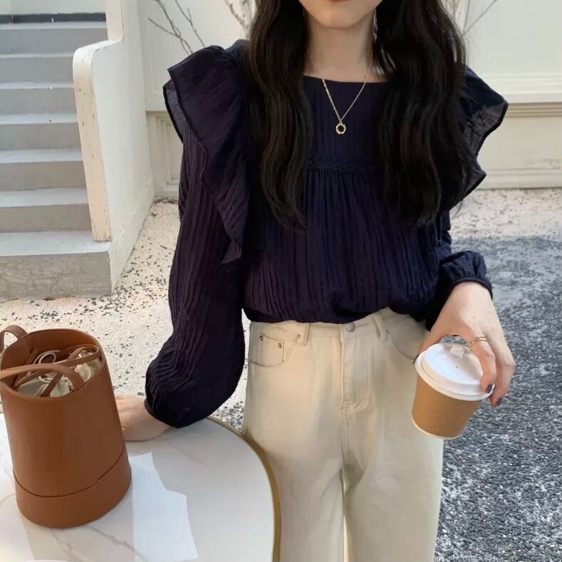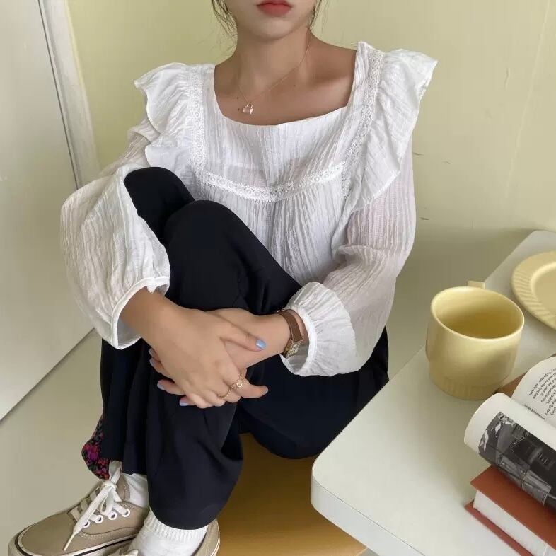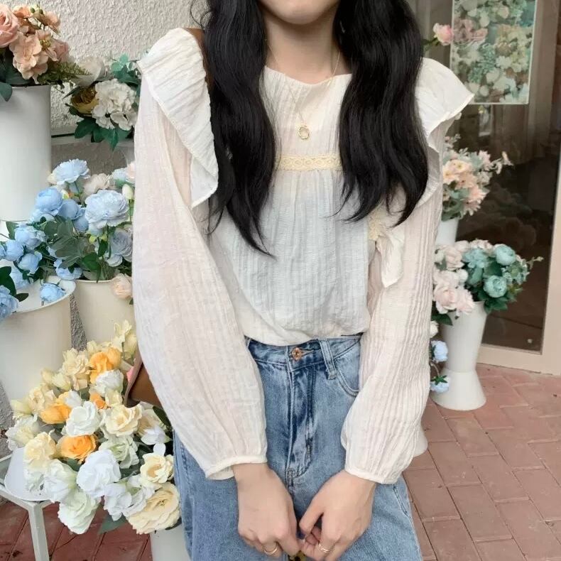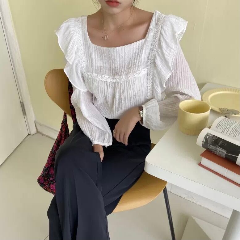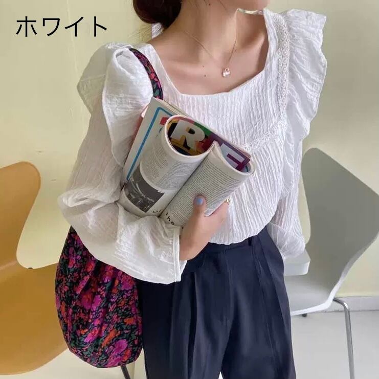 レディース トップス Tシャツ 白シャツ 白トップス 袖あり 長袖 ラウンドネック ギャザー レース シフォン フリル 透け感 ポリエステル 薄手 かわいい 大人可愛い カジュアル 大人 おしゃれ レトロ 大人可愛い 大人女子 メンズライク S M L 白 ホワイト オフホワイト ネイビー 無地 春 秋 2021 10代 20代 女性用 ママ OL 通勤 学生 通学 デート お出かけ 公園デビュー 女子会 休日 韓国系 オルチャン 新作 送料無料 トレンド | Rena 韓国ファッション レディースアパレル