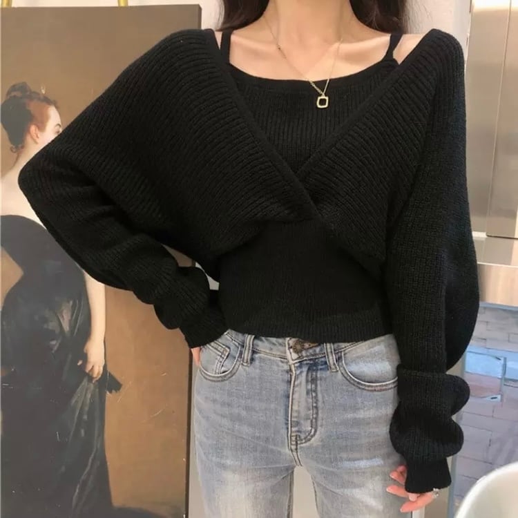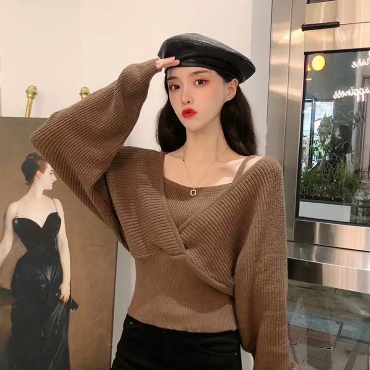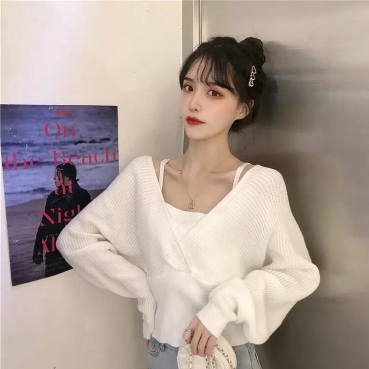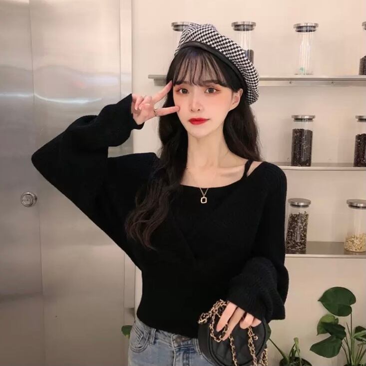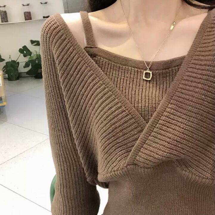 レディース トップス ニット セーター 袖あり 長袖 萌袖 Vネック スリム 切り替えデザイン リブ リブニット 伸縮性 ポリエステル 2点セット ツーピース お得 大人可愛い おしゃれ レトロ 大人女子 こなれ感 メンズライク ラブリー キュート モード系 セクシー フリーサイズ 白 ホワイト 黒 ブラック 茶色 ブラウン 無地 春 秋 2020 10代 20代 女性用 ママ 学生 通学 デート お出かけ 公園デビュー 女子会 休日 旅行 韓国系 オルチャン モテ 体系カバー 送料無料 | Rena 韓国ファッション レディースアパレル
