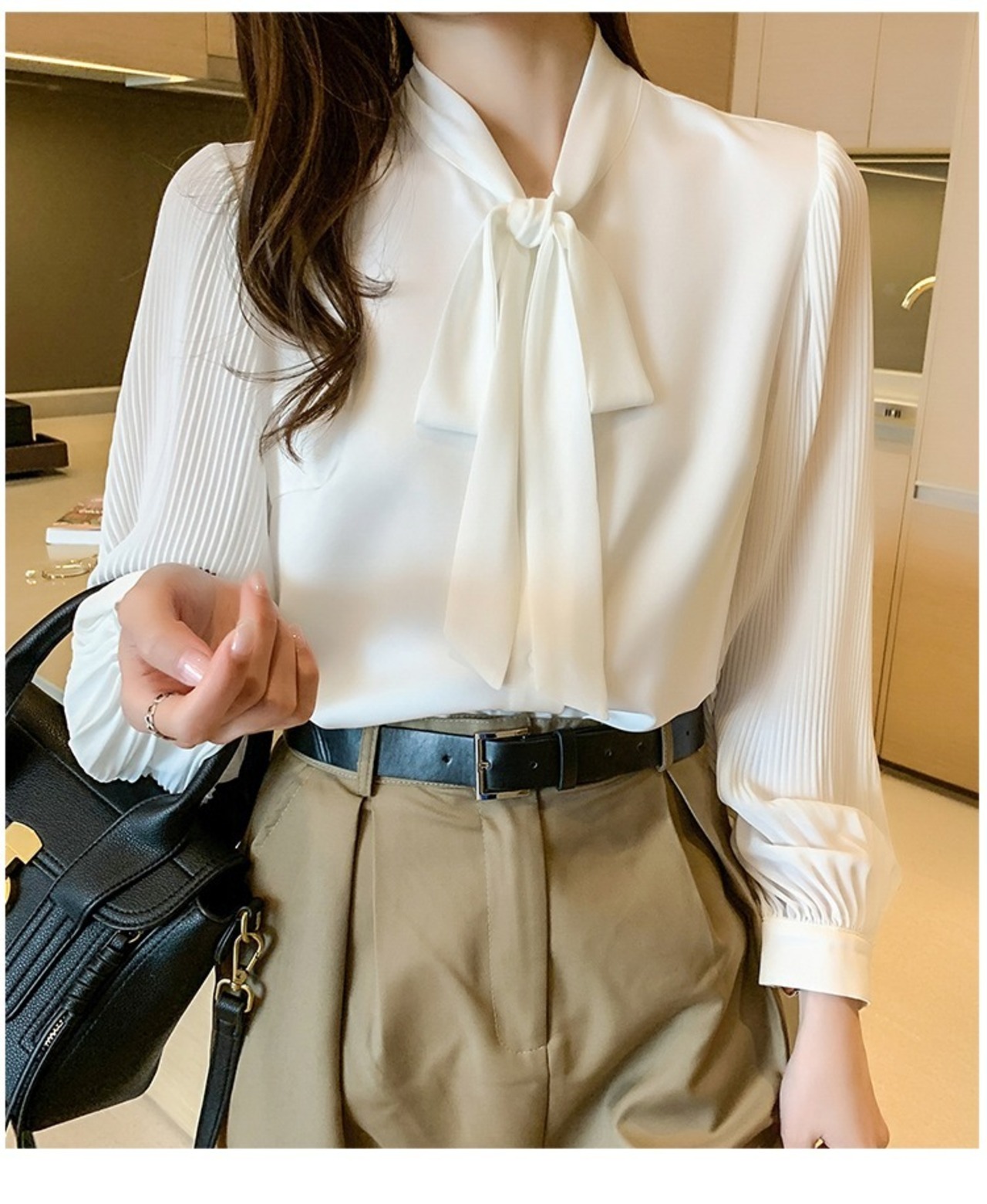 レディース トップス ブラウス 袖あり 長袖 襟付き プリーツ かわいい 大人可愛い きれいめ 大人 上品 おしゃれ お洒落 大人可愛い 大人女子 S M L XL 2XL 白 ホワイト 無地 春 秋 10代 20代 30代 オフィス ビジネス OL 通勤 通学 デート お出かけ 女子会 休日 旅行 普段使い ファッション コーデ 送料無料 | Rena 韓国ファッション レディースアパレル