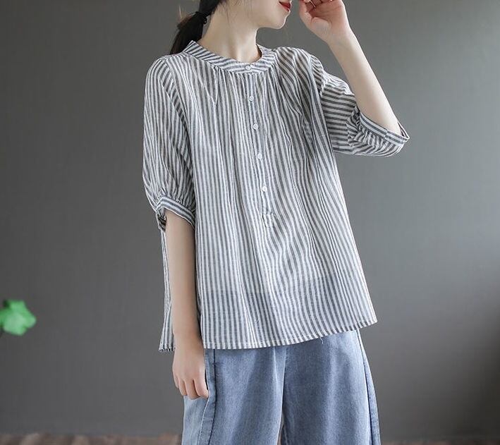 レディース トップス シャツ 袖あり 半袖 ラウンドネック かわいい シンプル カジュアル 大人 おしゃれ お洒落 大人可愛い 大人女子 こなれ感 ラフ M L XL 2XL 青 ブルー 灰色 グレー カーキ ストライプ 春 夏 10代 20代 30代 学生 通学 デート お出かけ 公園デビュー 休日 旅行 普段使い ファッション コーデ 送料無料 | Rena 韓国ファッション レディースアパレル