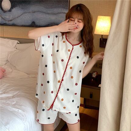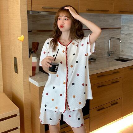 レディース ルームウェア パジャマ ショートパンツ 半袖 前開き 2点セット かわいい シンプル カジュアル おしゃれ レトロ ラフ キュート ルーズ フリーサイズ 水玉 春 夏 10代 20代 お泊まり 休日 コーデ スタイル 楽ちん 送料無料 | Rena 韓国ファッション レディースアパレル