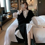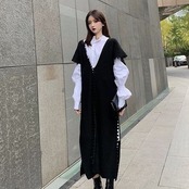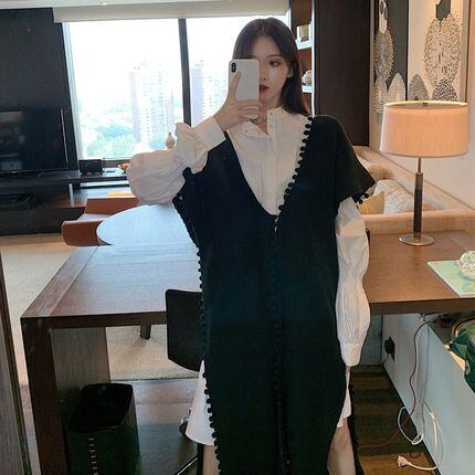 レディース トップス ワンピース シャツ シャツワンピース ロング ロング丈 袖あり 長袖 ボリューム袖 クルーネック 襟付き ストレート 裾フレア 前開き 2点セット かわいい 大人可愛い きれいめ シンプル カジュアル おしゃれ お洒落 かっこいい レトロ 大人可愛い 大人女子 こなれ感 ラフ ボーイッシュ 個性的 クール S M L XL 白 ホワイト 黒 ブラック 秋 2021 20代 30代 重ね着 韓国 韓国系 コーデ スタイル モテ 新作 プチプラ 送料無料 トレンド 流行 インスタ映え | Rena 韓国ファッション レディースアパレル