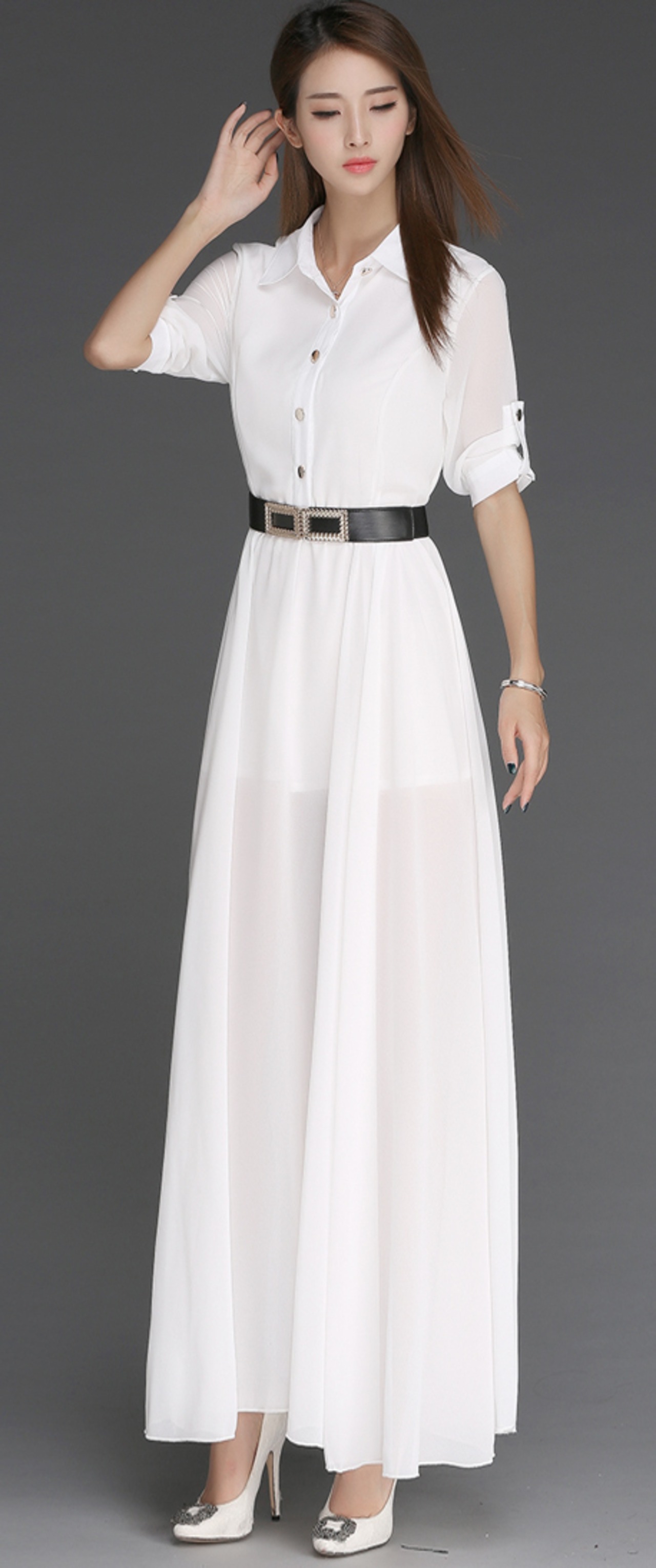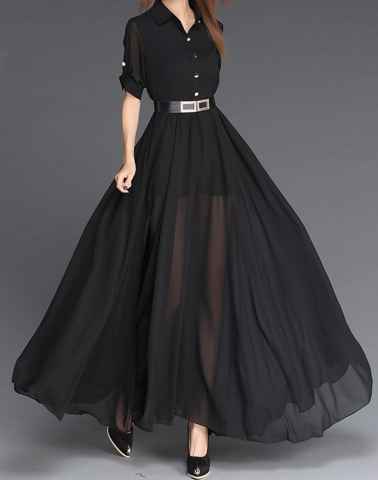 ワンピース フレアワンピース ロング丈 7分袖 Vネック 襟付き フレア シフォン ベルト ハイウエスト 透け感 シースルー 薄手 上下セット 2点セット 大人可愛い きれいめ シンプル 大人 上品 おしゃれ かっこいい 大人可愛い 大人女子 こなれ感 セクシー エレガント S M L XL ホワイト ブラック 無地 春 夏 秋 10代 20代 30代 40代 50代 女性用 デート お出かけ 女子会 パーティー イベント ファッション コーデ スタイル モテ 送料無料 | Rena 韓国ファッション レディースアパレル