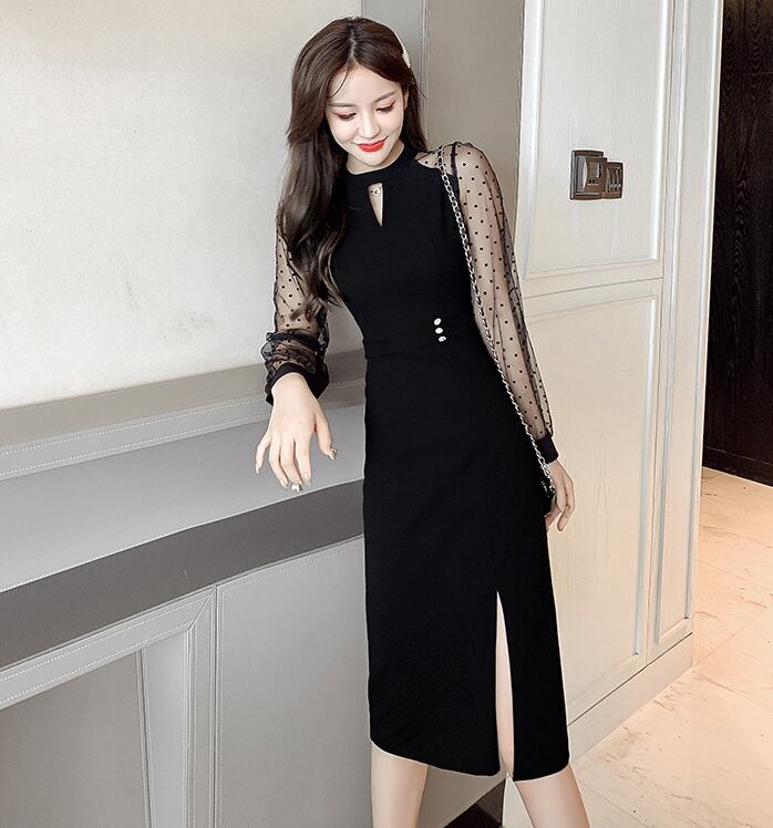 ドレス パーティードレス 二次会ドレス 膝丈 サイドスリット シースルー ひざ丈 袖あり 長袖 クルーネック レース フォーマル エレガント かわいい 大人可愛い きれいめ シンプル 大人 上品 おしゃれ 主役級 キュート ガーリー セクシー S M L XL 黒 ブラック 大人カラー 無地 ドット柄 冬 クリスマス 10代 20代 30代 40代 50代 レディース イベント レストラン ファッション コーデ スタイル モテ 送料無料 | Rena 韓国ファッション レディースアパレル