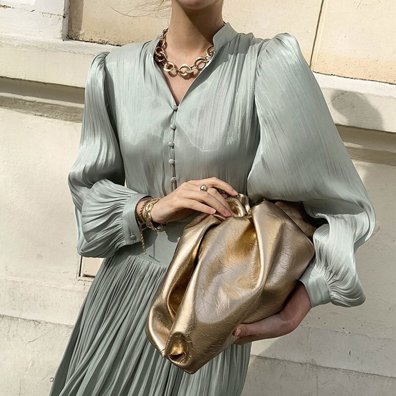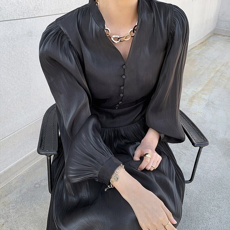 ワンピース 9分丈 長袖 ボリューム袖 Vネック プリーツ レトロ エレガント かわいい 大人可愛い きれいめ シンプル ゴージャス 華やか 大人 上品 おしゃれ 主役級 ラブリー キュート ガーリー お姫様 フリーサイズ ホワイト ブラック グリーン 大人カラー 無地 二次会 お呼ばれ パーティ 10代 20代 30代 40代 50代 レディース イベント レストラン ファッション コーデ スタイル モテ 送料無料 | Rena 韓国ファッション レディースアパレル
