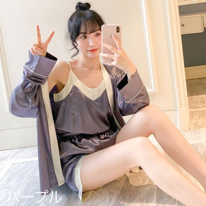 レディース セットアップ ルームウェア パジャマ キャミソール ガウン ネグリジェ ショート 袖なし ノースリーブ 前開き 2点セット ツーピース かわいい ラブリー キュート ガーリー 個性的 セクシー M L XL 2XL 赤 レッド 紫 パープル ピンク 光沢 無地 女性用 女の子 パーティー イベント ファッション スタイル モテ 送料無料 | Rena 韓国ファッション レディースアパレル