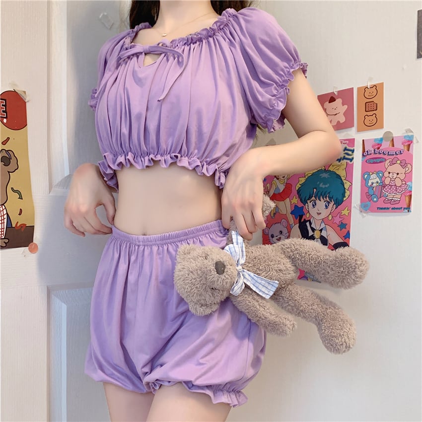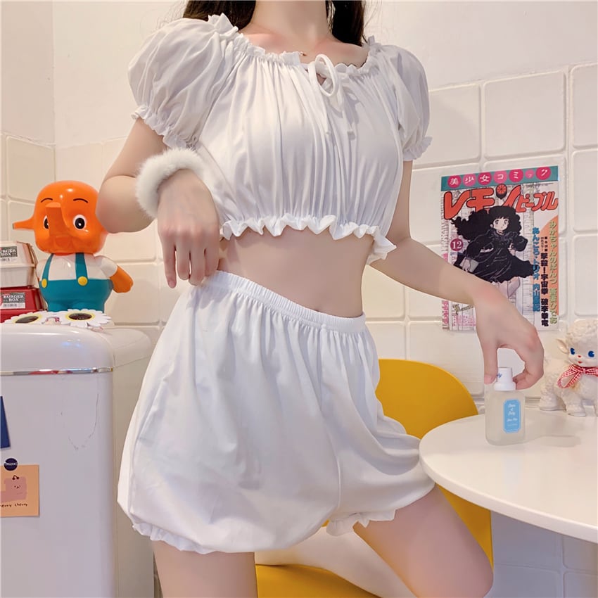レディース セットアップ ルームウェア パジャマ 部屋着 寝巻き ナイトウェア ネグリジェ ミニ ミニ丈 ショート ショート丈 袖あり 半袖 パフスリーブ ギャザー 上下セット 2点セット ツーピース かわいい ラブリー キュート ガーリー セクシー 主役級 フリーサイズ 白 ホワイト 紫 パープル 無地 オールシーズン 10代 20代 女性用 女の子 | Rena 韓国ファッション レディースアパレル