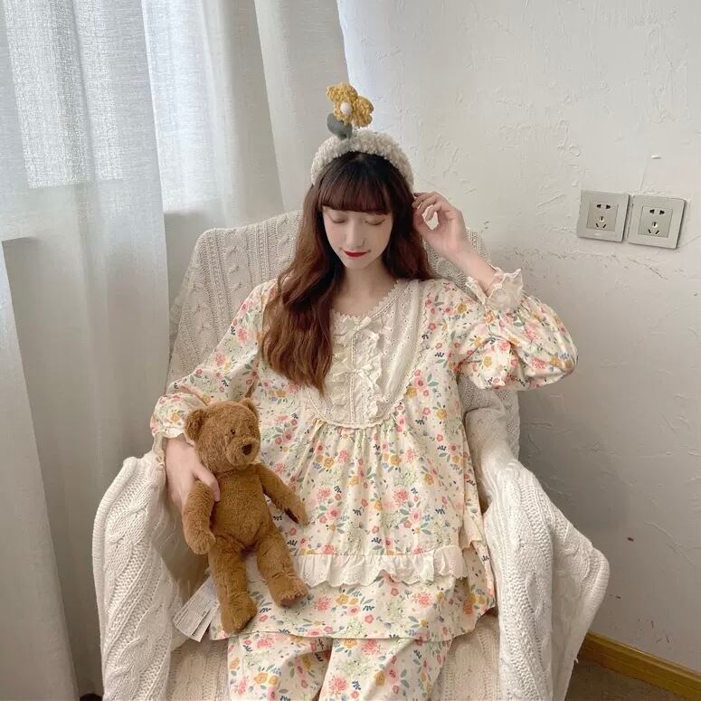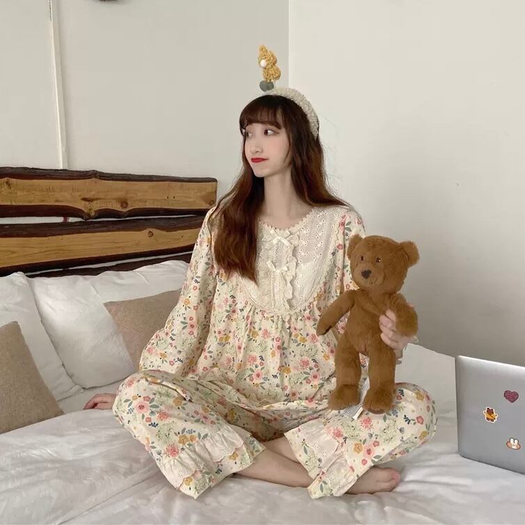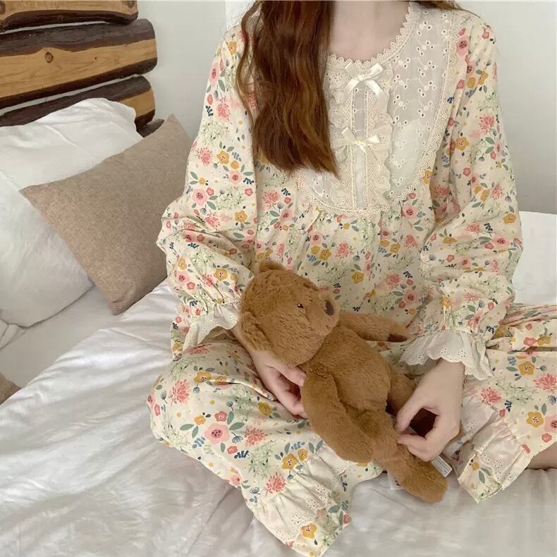 レディース ルームウェア パジャマ 部屋着 寝巻き ナイトウェア ロング 9分丈 袖あり 長袖 Uネック 裾フレア レース フリル リボン ウエストゴム 薄手 上下セット 2点セット ツーピース お得 かわいい 大人可愛い 大人女子 ラフ メンズライク ラブリー キュート ガーリー 抜け感 フリーサイズ 白 ホワイト 柄 花柄 小花柄 フラワー 春 秋 2020 10代 20代 ママ 女子会 お泊まり 休日 普段使い 韓国 韓国系 オルチャン 楽ちん モテ 体系カバー 新作 送料無料 ゆったり | Rena 韓国ファッション レディースアパレル