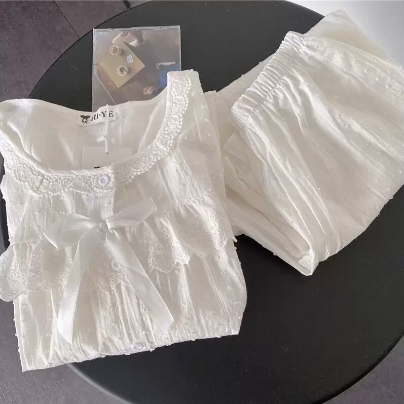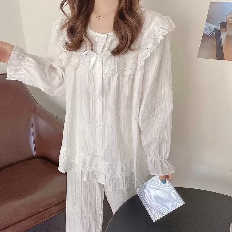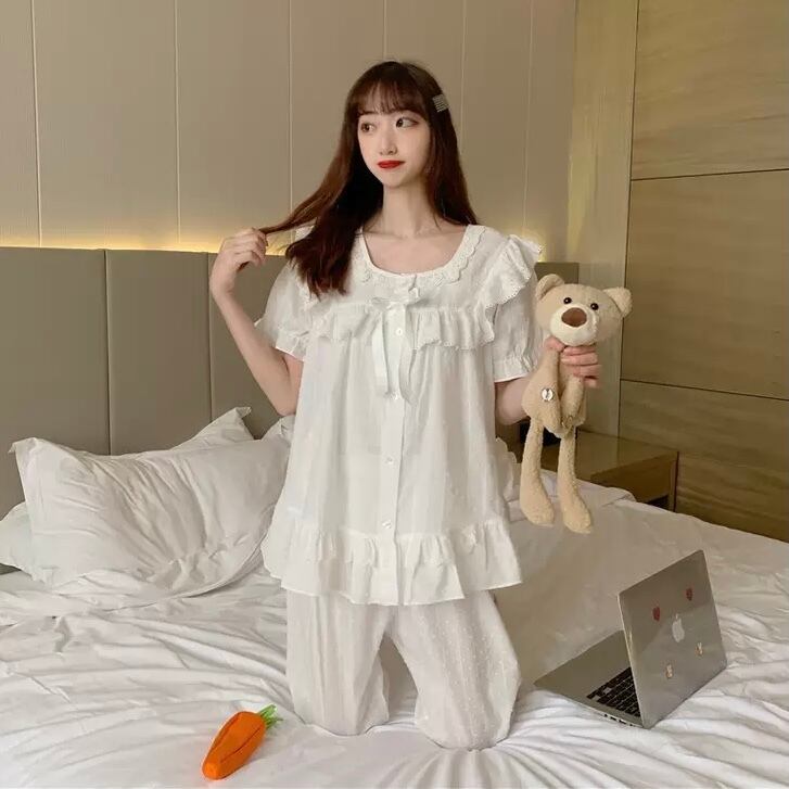 レディース ルームウェア パジャマ 部屋着 寝巻き ナイトウェア 膝下 ミディアム丈 袖あり 半袖 長袖 Uネック ラウンドネック 裾フレア レース フリル リボン 前開き ウエストゴム 綿 薄手 上下セット 2点セット ツーピース お得 かわいい 大人可愛い きれいめ シンプル 大人女子 メンズライク ラブリー キュート ガーリー フリーサイズ 白 ホワイト 無地 夏 10代 20代 ママ 女子会 お泊まり 休日 普段使い 韓国系 オルチャン 楽ちん モテ 体系カバー 送料無料 ゆったり | Rena 韓国ファッション レディースアパレル