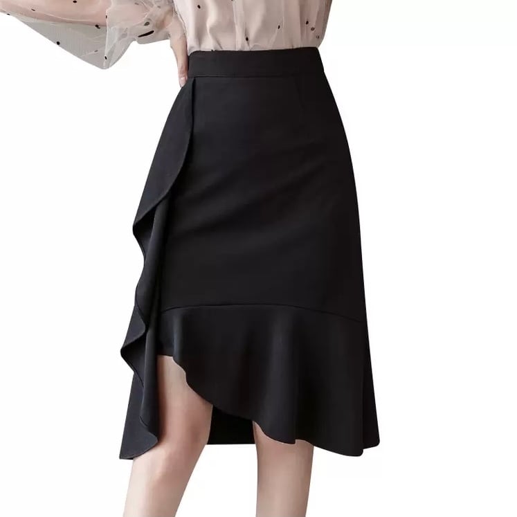 レディース スカート ボトムス ひざ丈 ミディアム丈 Aライン マーメイド アシンメトリー 裾フレア フィッシュテール フリル ファスナー ハイウエスト きれいめ 大人 上品 おしゃれ 大人女子 メンズライク キュート ガーリー 個性的 セクシー S M L XL 2XL ブラック 無地 春 夏 2021 10代 20代 30代 女性用 ママ OL 通勤 学生 通学 デート お出かけ 女子会 休日 韓国系 オルチャン コーデ モテ 美脚 新作 送料無料