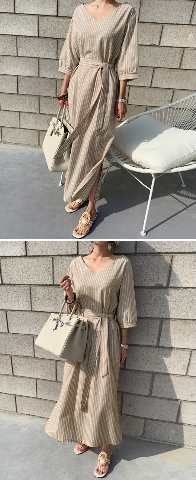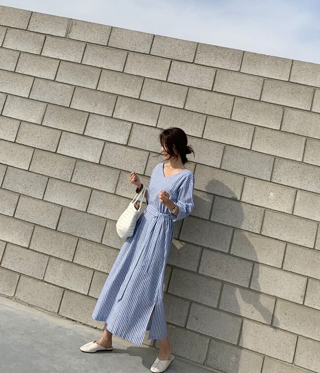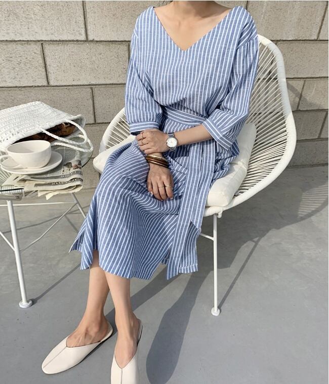 ワンピース ロング丈 七分袖 Vネック ストライプ ウエストマーク 春 夏 秋 きれいめ さわやか シンプル 大人 上品 おしゃれ お洒落 レトロ 大人女子 キュート M L XL 青 ブルー ベージュ ストライプ 10代 20代 30代 40代 OL 通勤 学生 デート お出かけ 女子会 休日 パーティー イベント リゾート 旅行 ファッション コーデ 送料無料 | Rena 韓国ファッション レディースアパレル